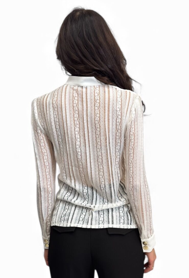 Elegancka, biała koszula z koronką i plisami od marki Gil Santucci to wyjątkowy model, który łączy nowoczesną kobiecość z klasyczną elegancją. Idealna dla kobiet, które chcą wyróżnić się subtelnym, dopracowanym stylem. Koszula została wykonana z delikatnego materiału z pionowymi plisowaniami, które optycznie wysmuklają sylwetkę i nadają całości lekkości. Koronkowe rękawy dodają całości romantycznego, luksusowego charakteru – pełne finezyjnych wzorów, przejrzyste, ale jednocześnie eleganckie.