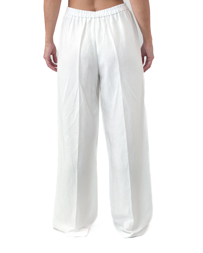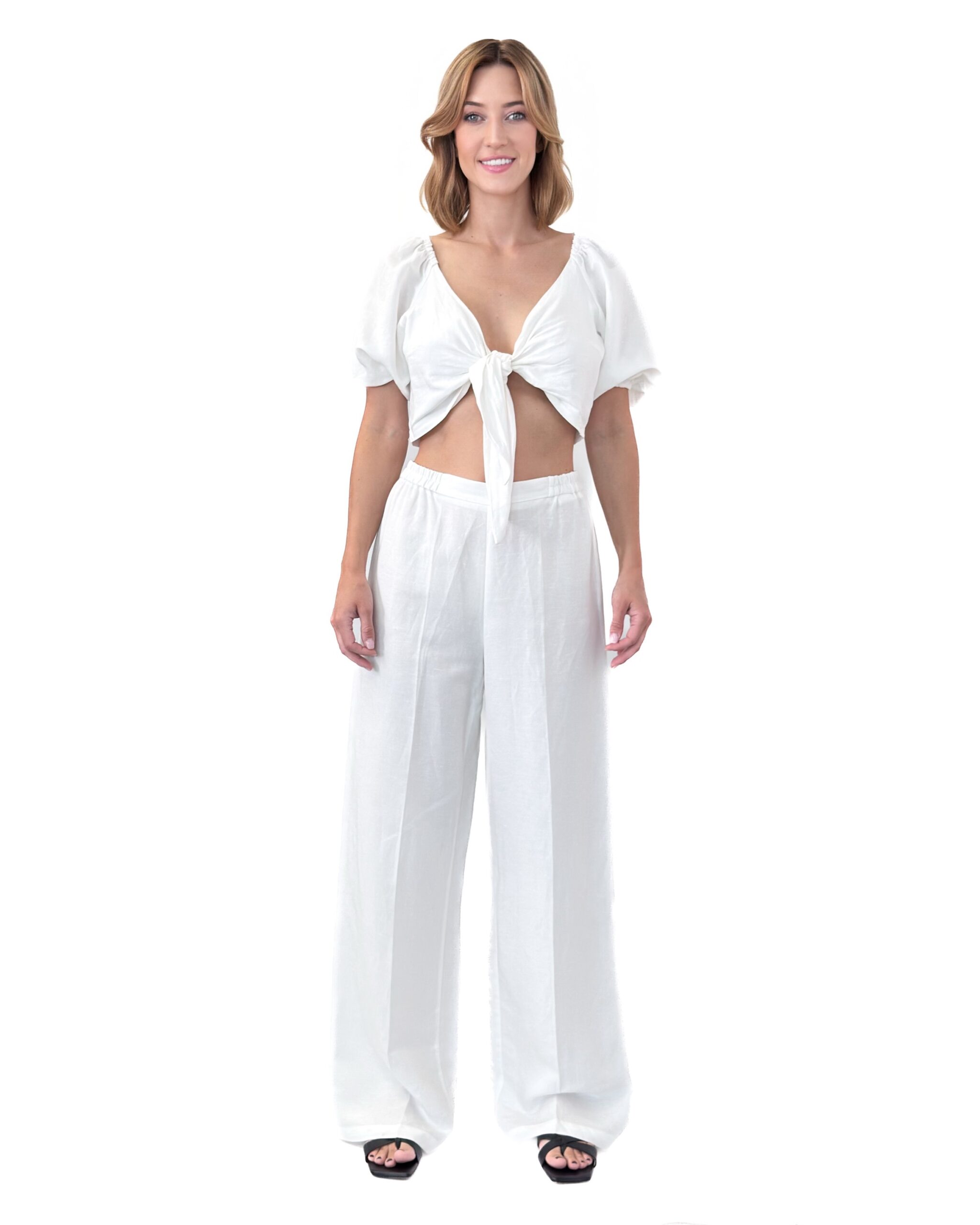 Stylowy, biały komplet damski z lnu i wiskozy – szerokie spodnie i krótki top wiązany na wysokości biustu. Lekki, przewiewny i idealny na lato.