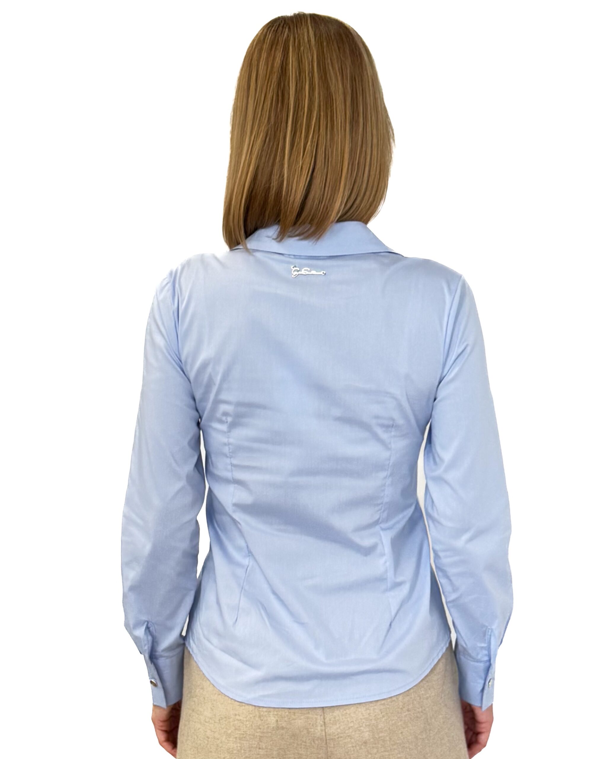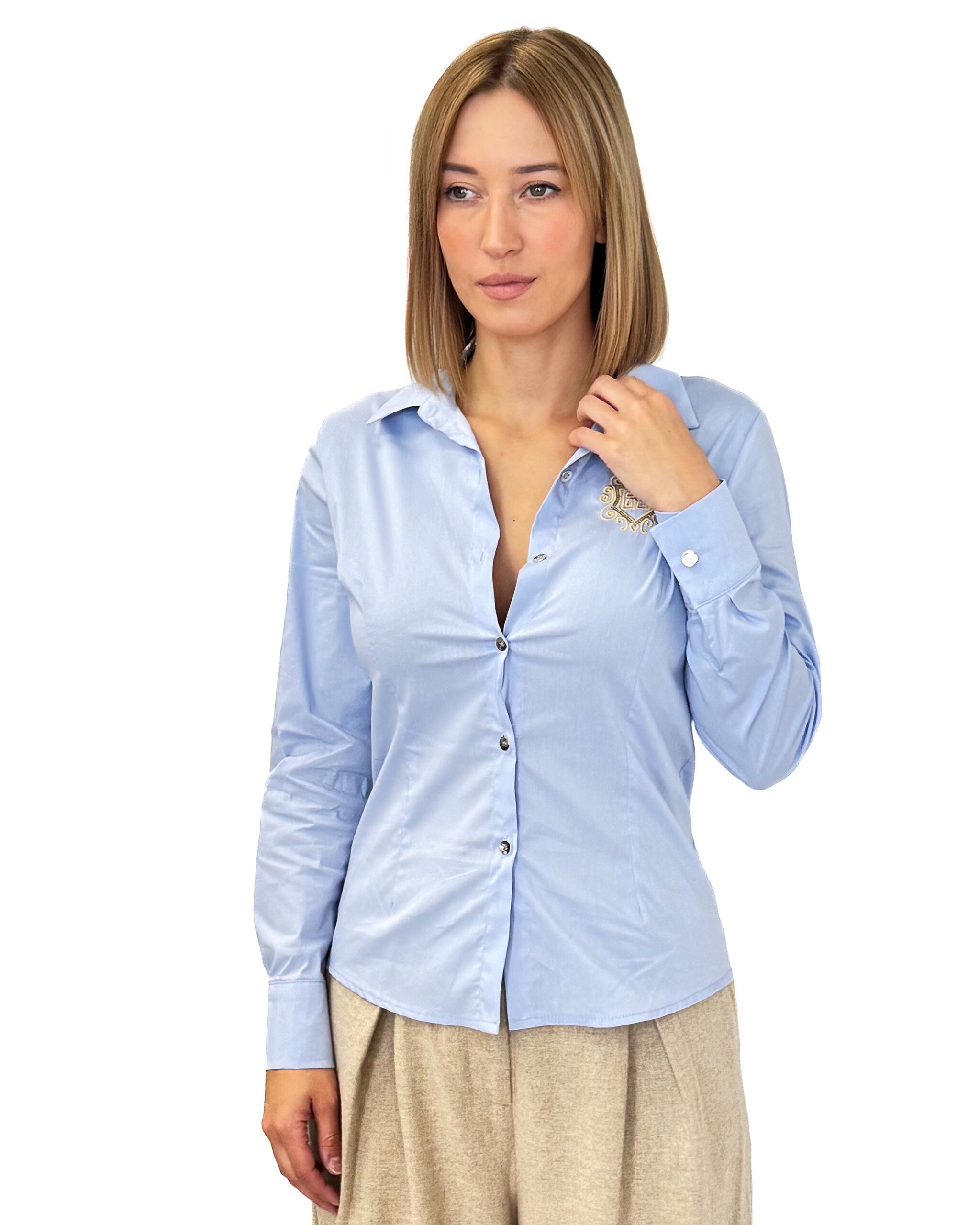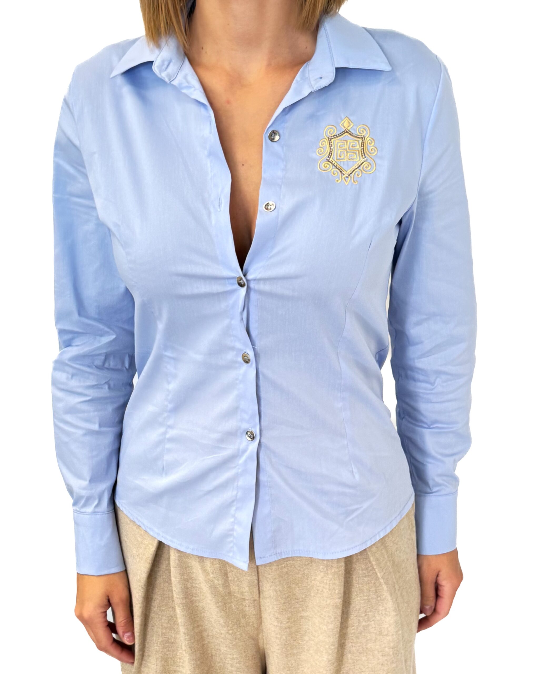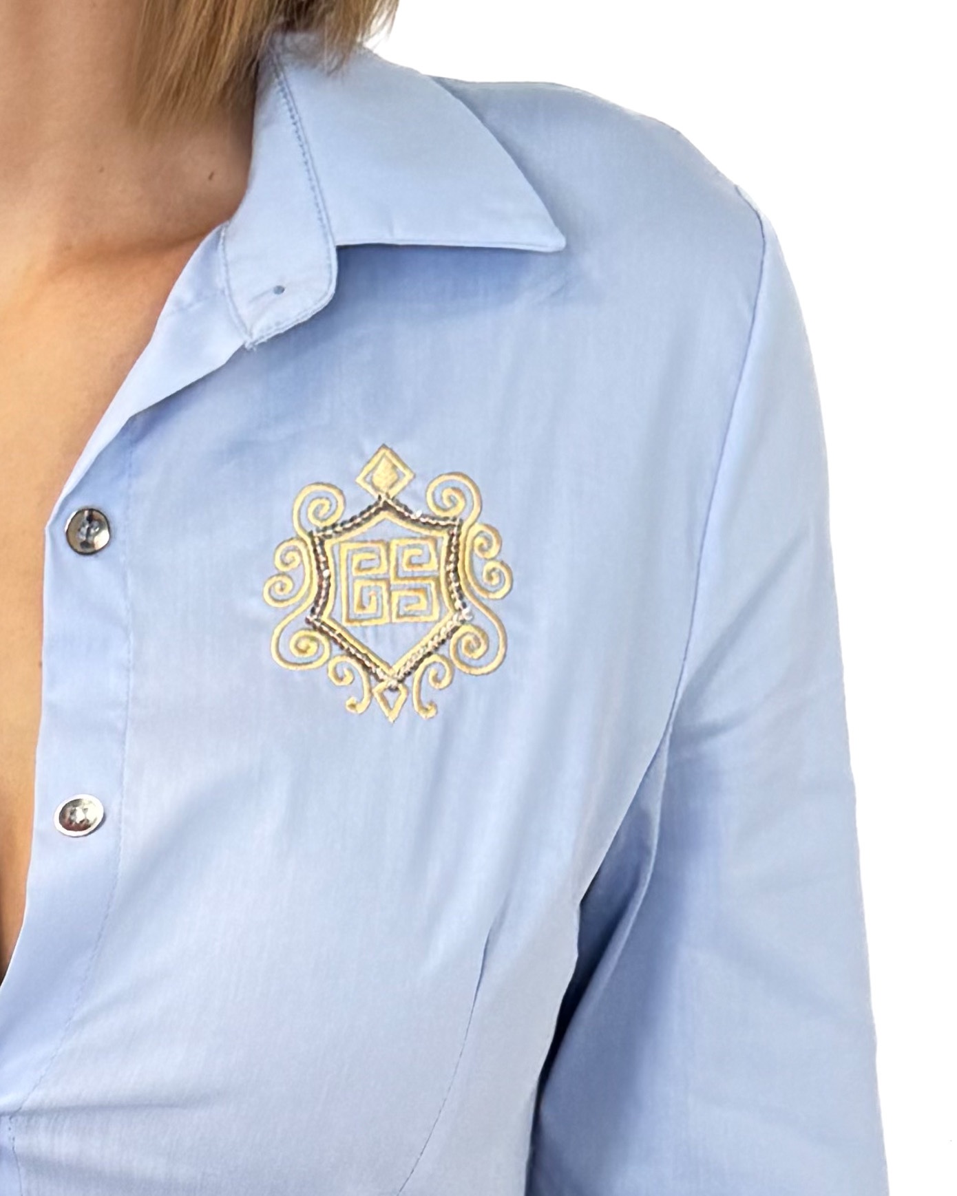Błękitna koszula damska marki Gil Santucci z długim rękawem, zapinana na guziki. Złote wyszywane zdobienie na lewej piersi dodaje elegancji i szyku.