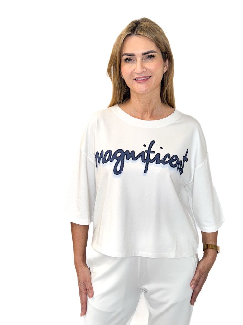 Opis: Luźny fason, rękaw do łokcia, dekolt okrągły obszyty ściągaczem, z przodu napis w kolorze granatowym//niebieskim z dodatkiem granatowych cekinów