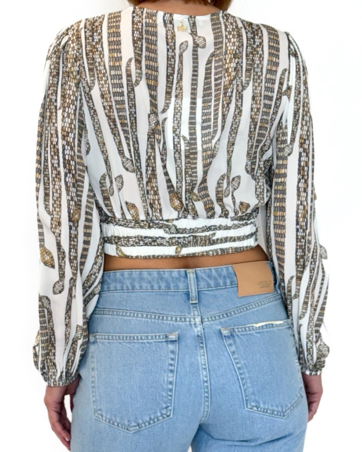 Bluzka Artigli to krótka koszula wiązana w pasie, która doskonale podkreśla sylwetkę i dodaje kobiecości. Tego typu koszule często łączą elegancję z casualowym stylem, dzięki czemu możesz je nosić zarówno na co dzień, jak i na bardziej formalne okazje. Bluzka z kolekcji Wiosna/ Lato 2025 wykonana ze wzorzystej tkaniny. Model z delikatnego, przewiewnego materiału idealnego na cieplejsze pory roku.