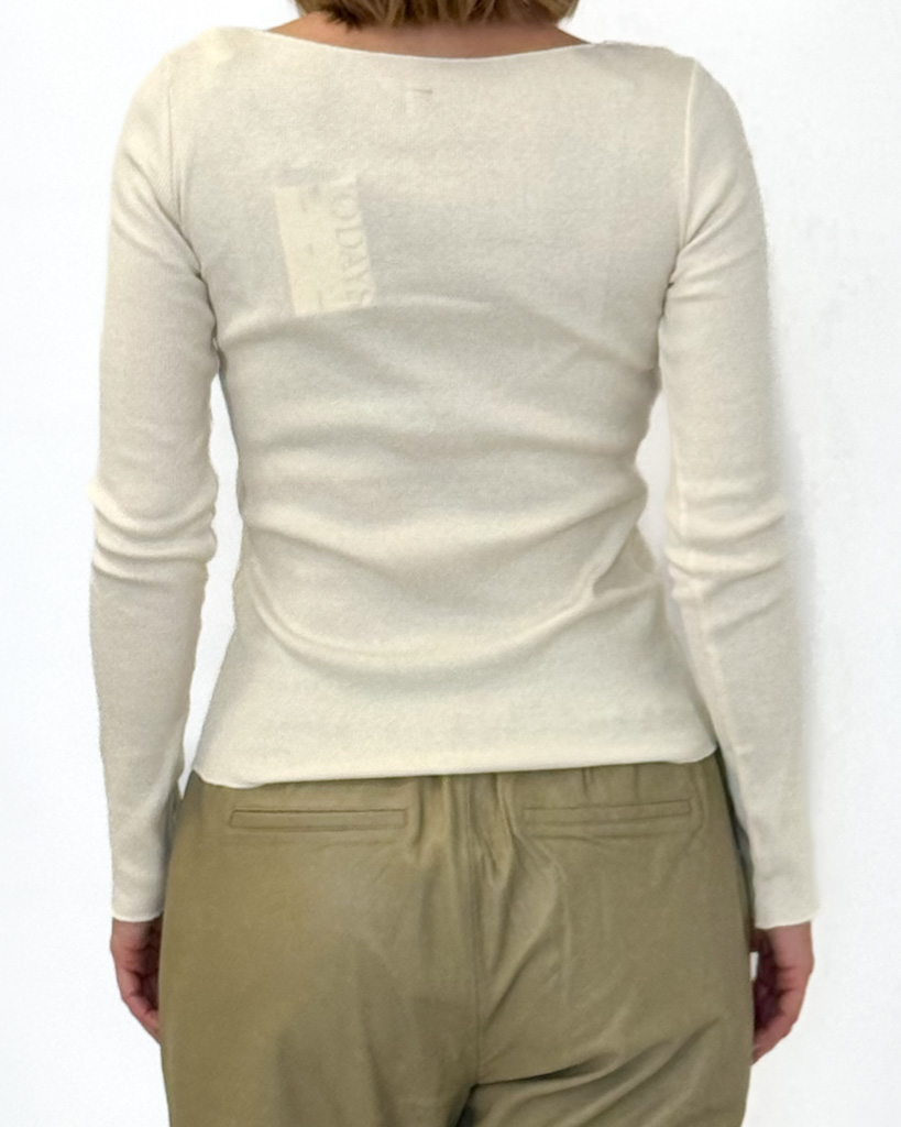 Na karku znajduje się eleganckie, srebrne haftowane logo marki, dodające subtelnego luksusu i podkreślające wysoką jakość wykonania. Delikatny prążkowany wzór nadaje całości nowoczesnego charakteru i sprawia, że bluzka doskonale prezentuje się w każdej stylizacji – zarówno z jeansami, spódnicą, jak i pod marynarkę.