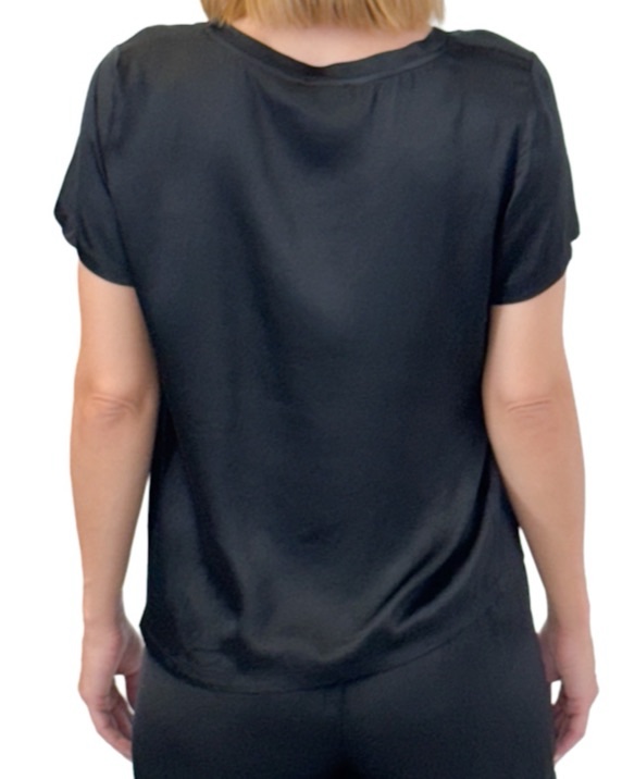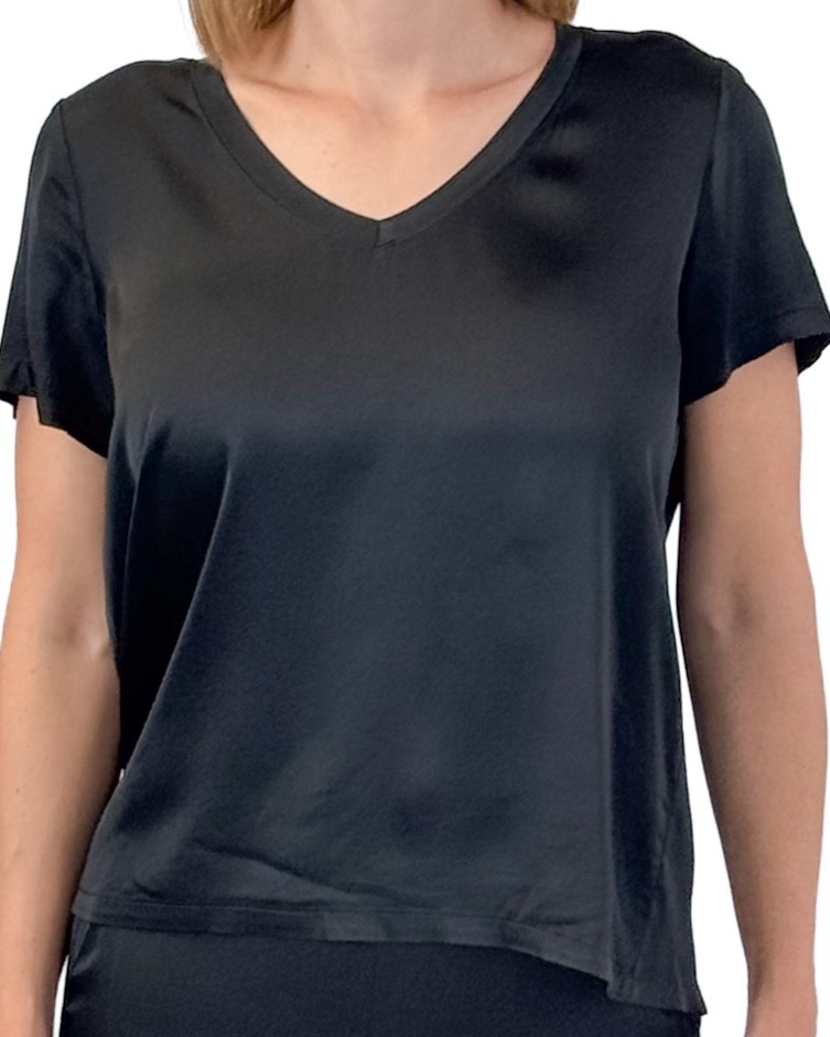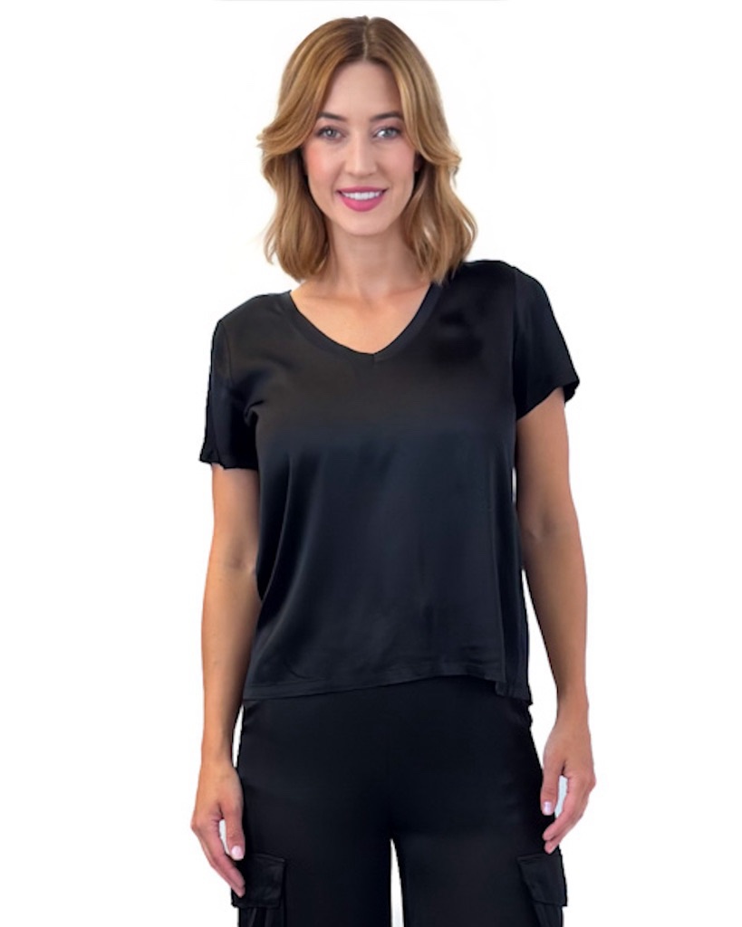 Czarna bluzka damska z krótkim rękawem i dekoltem w szpic. Połyskująca, lekka, wykonana z wiskozy – idealna na eleganckie i codzienne stylizacje.