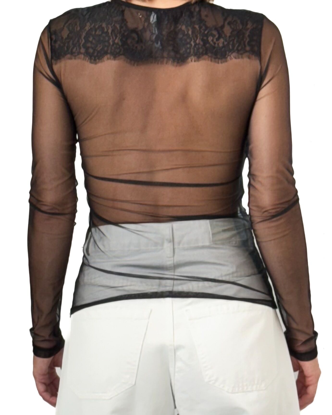 Czarna bluzka z siateczki i koronką, dopasowany fason, długi rękaw i okrągły dekolt. Elegancka i kobieca – idealna na wieczór i specjalne okazje.