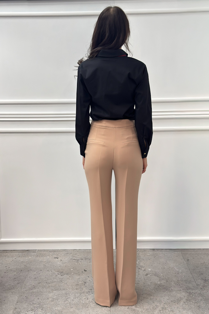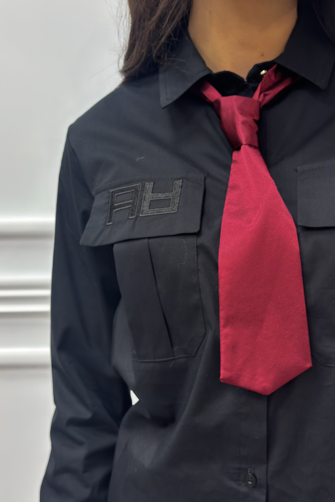 Damska, czarna koszula z bordowym krawatem o prostym kroju z kieszeniami marki Artigli. Elegancka, nowoczesna i efektowna – idealna do pracy, na co dzień.