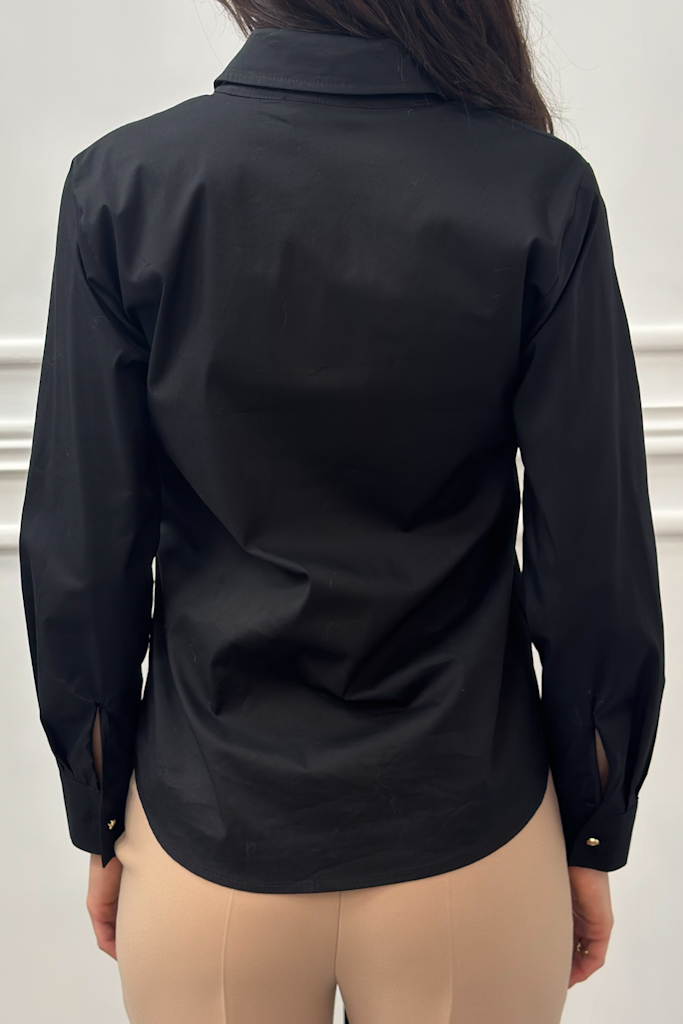Dzięki klasycznemu kołnierzykowi, praktycznym kieszeniom z przodu oraz dopracowanym liniom, koszula sprawdzi się nie tylko w codziennych zestawach, ale również w stylizacjach biznesowych, wieczorowych czy modowych lookach typu „street style”. Czarny kolor czyni ją uniwersalną bazą, a struktura materiału nadaje całości elegancji. To doskonały wybór dla kobiet, które chcą wyglądać profesjonalnie, oryginalnie i podkreślić swój indywidualny styl.