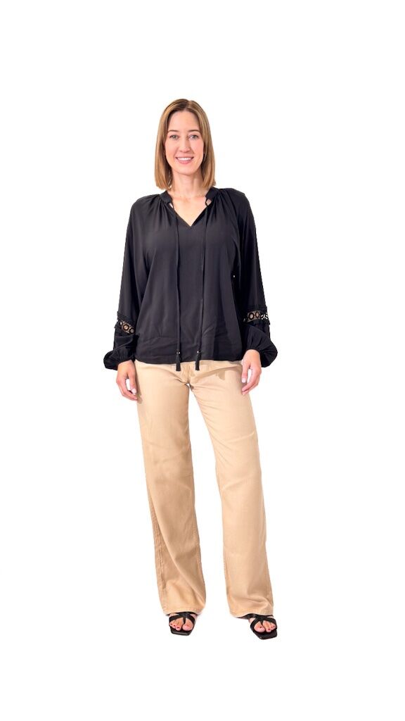 Dodaj swojej garderobie odrobinę elegancji z tą klasyczną czarną bluzką z wiskozy, ozdobioną delikatną gipiurką na rękawach oraz stylowymi frędzelkami na sznureczkach i gumką na rękawie. Dzięki tym detalom bluzka zyskuje niepowtarzalny, lekko boho charakter, który wyróżni Cię z tłumu.