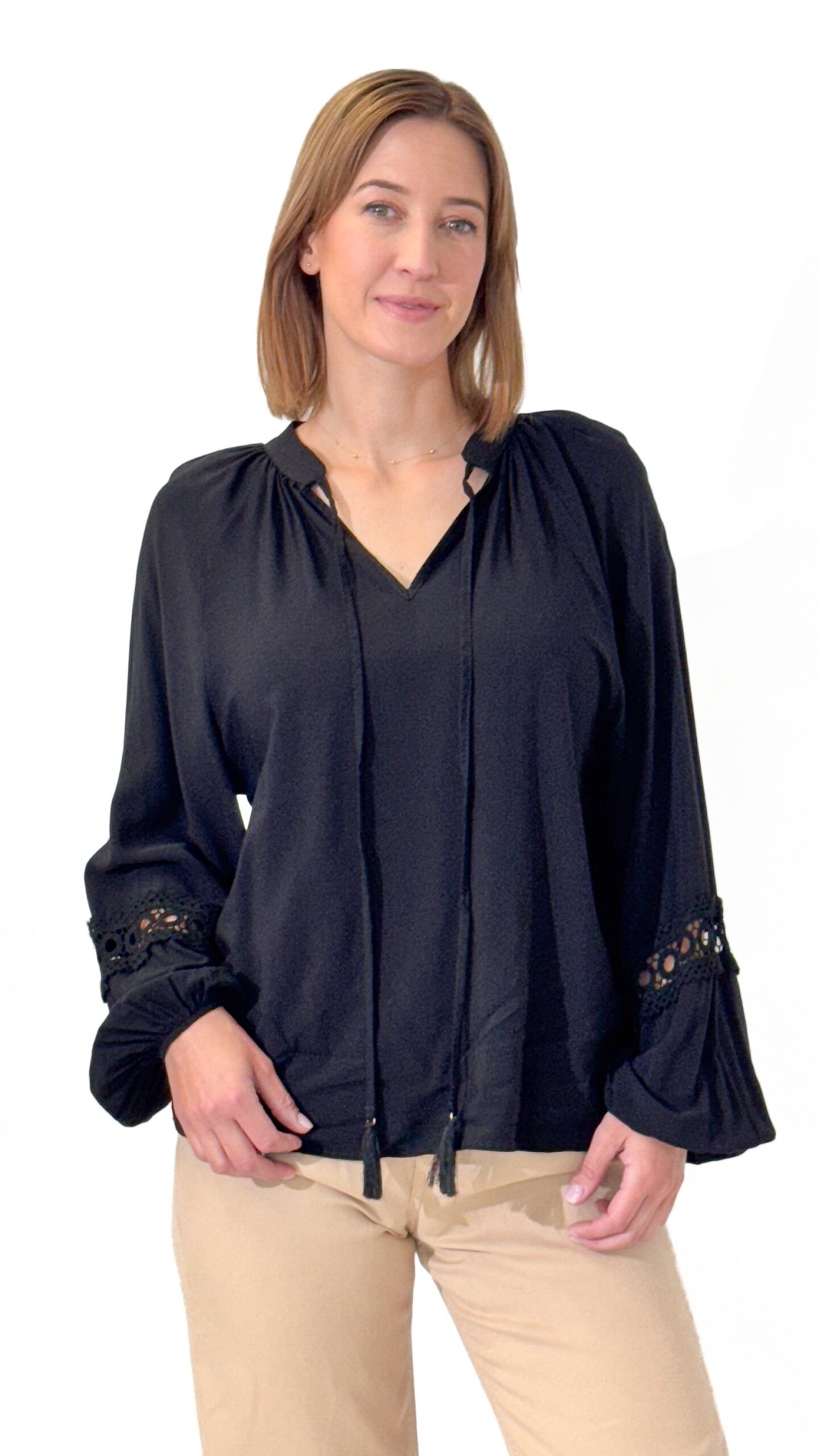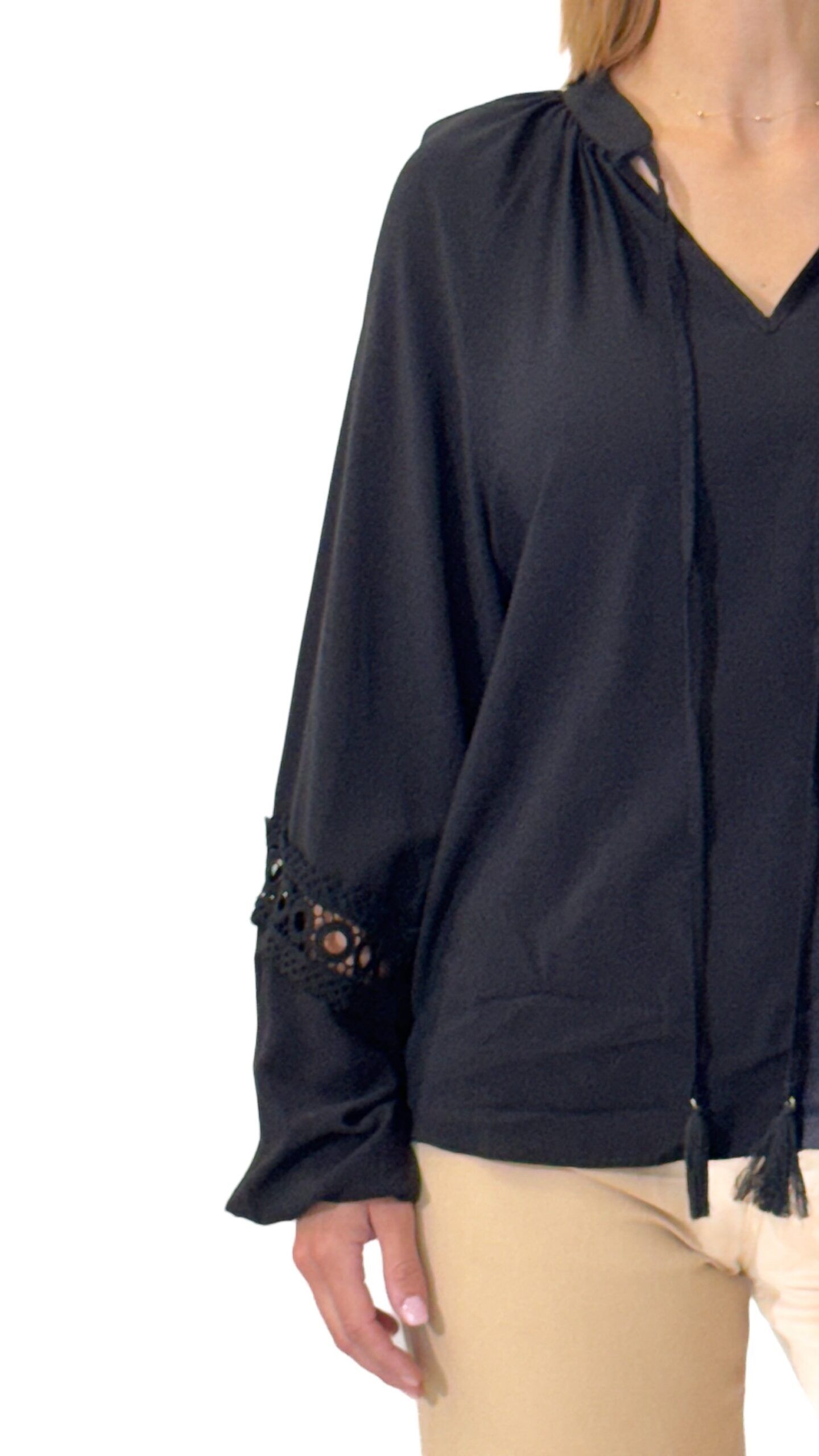 Elegancka, czarna bluzka damska z wiskozy z koronkową gipiurką, frędzelkami na sznureczkach i gumką na rękawach. Stylowa i wygodna – idealna na każdą okazję!