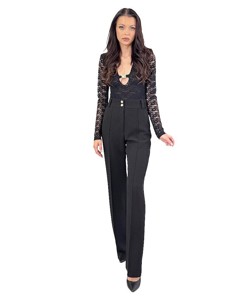 Czarne koronkowe body damskie z długim rękawem i głębokim dekoltem w szpic ozdobionym złotą blaszką to ponadczasowy element garderoby, który doskonale łączy zmysłowość z elegancją. To body świetnie sprawdzi się w wielu stylizacjach — zarówno na wieczorne wyjścia, jak i eleganckie spotkania. Możesz nosić je: