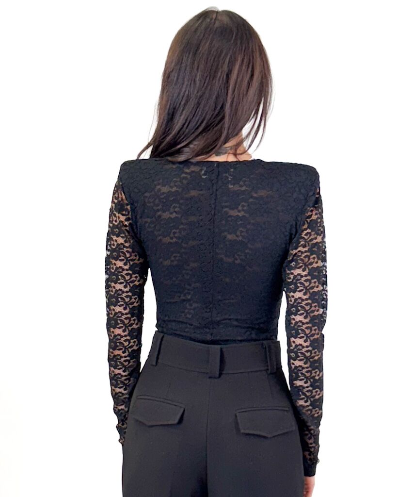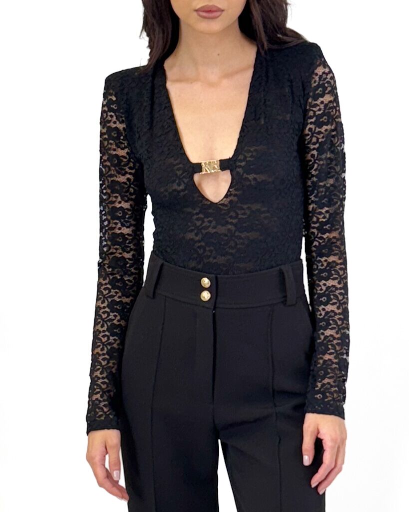 Czarne, koronkowe body z długim rękawem i dekoltem w szpic ozdobionym złotą blaszką z logo. Elegancki fason z poduszkami na ramionach od marki Revise.