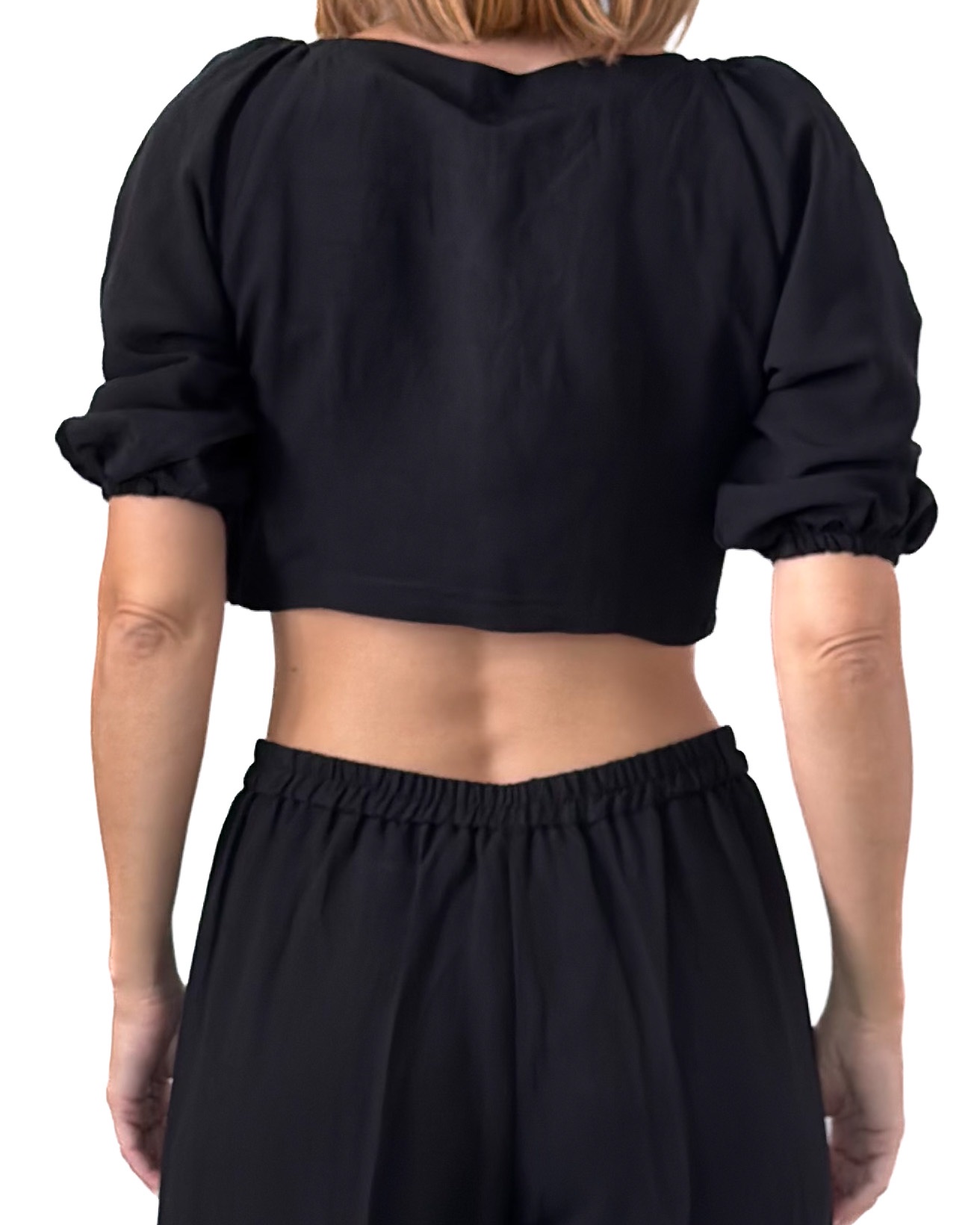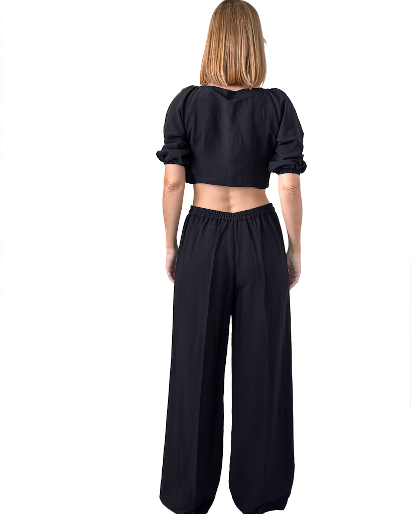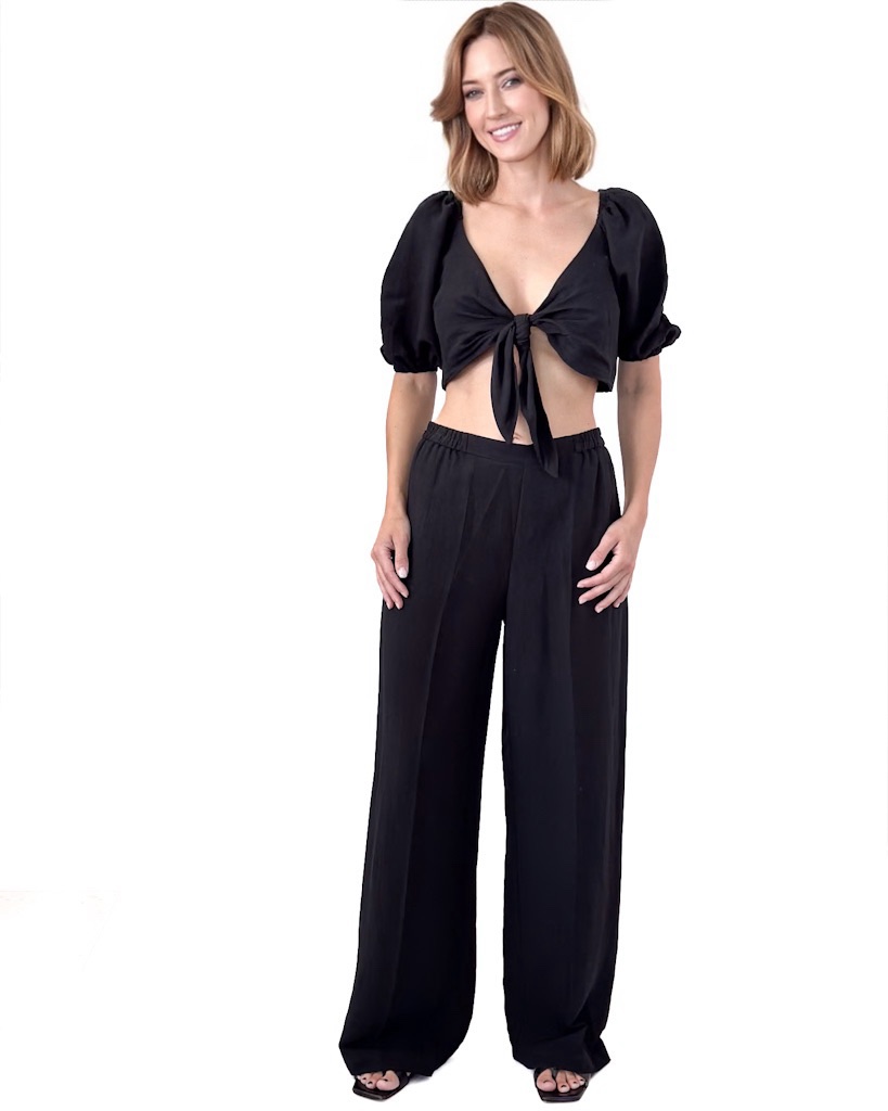 Stylowy, czarny komplet damski z lnu i wiskozy – szerokie spodnie i krótki top wiązany na wysokości biustu. Lekki, przewiewny i idealny na lato.