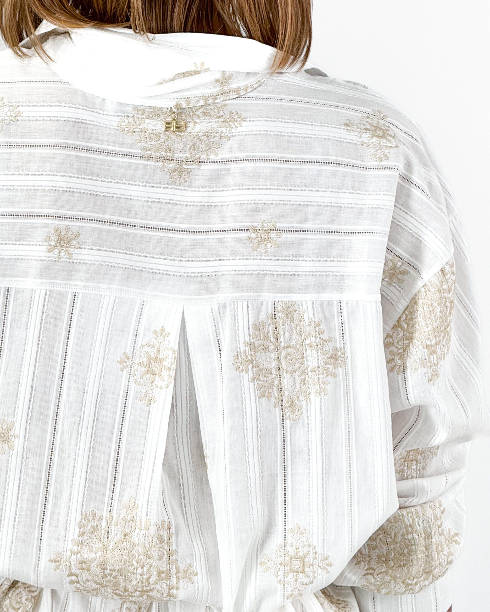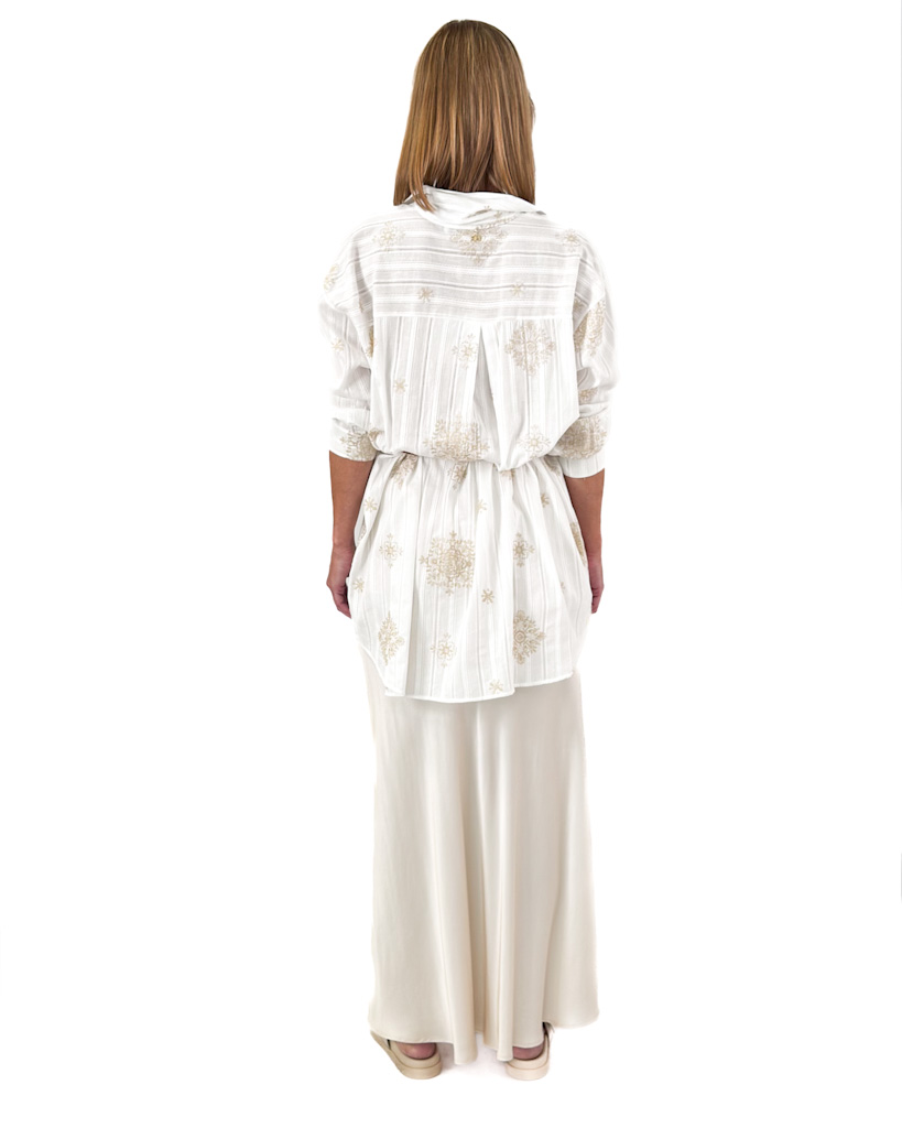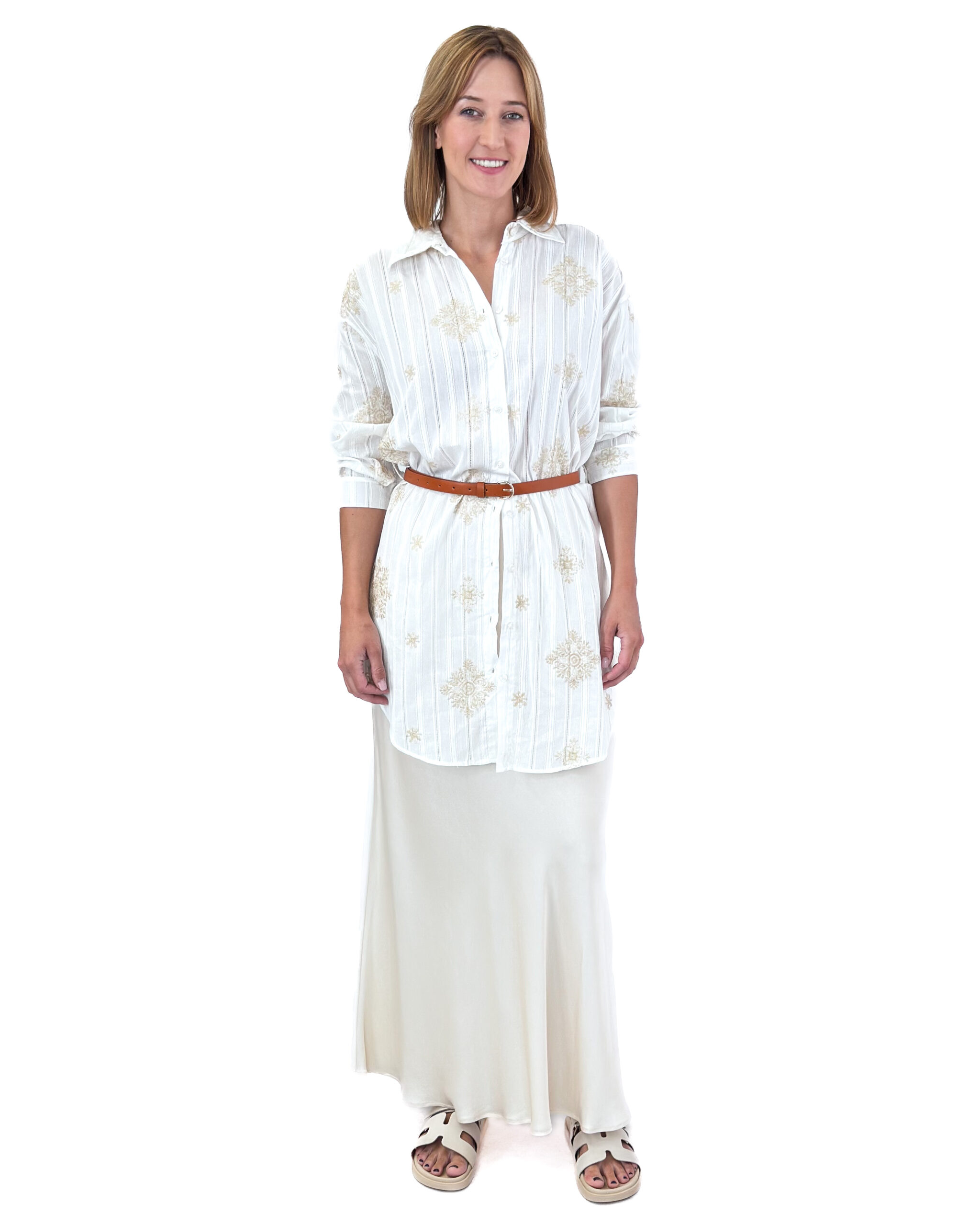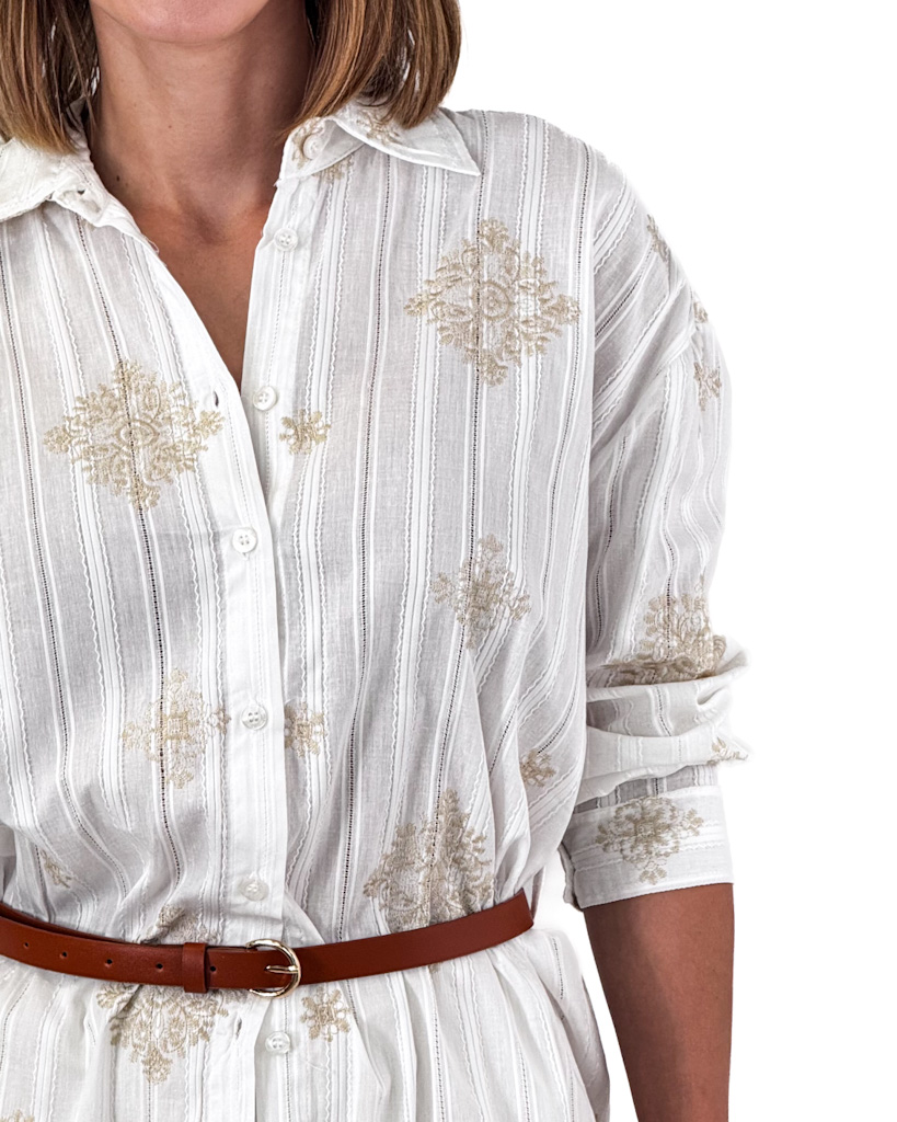 Odkryj wyjątkową koszulę boho z paskiem, z długim rękawem, haftami i brązowym paskiem. Stylowy, dłuższy fason, zapinana na guziki – idealna na lato!