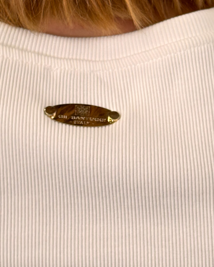 Kremowa bluzka bez rękawów w prążek to elegancka propozycja na lato i wiosnę, która łączy klasykę z modnym detalem. Wykonana z wysokiej jakości bawełny pięknie układa się na sylwetce, a pionowy prążek optycznie wysmukla i wydłuża figurę. Dekolt zdobią subtelne, złote, logowane guziki, które dodają bluzce szyku i delikatnego, biżuteryjnego akcentu.
