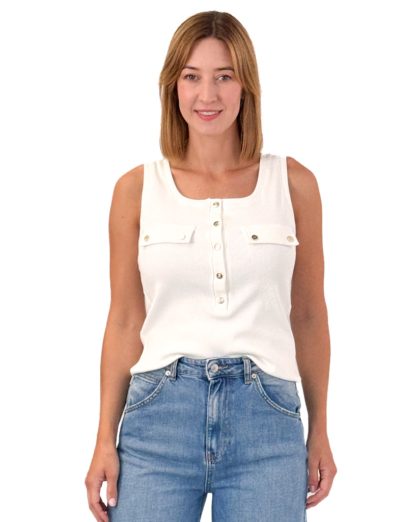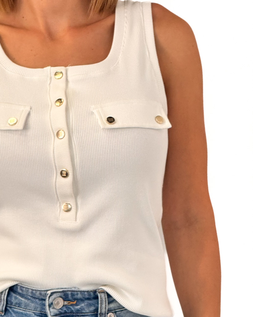 Kremowa bluzka w prążek bez rękawów, ze złotymi guzikami na dekolcie. Lekka, elegancka, idealna na lato — do pracy i na co dzień.