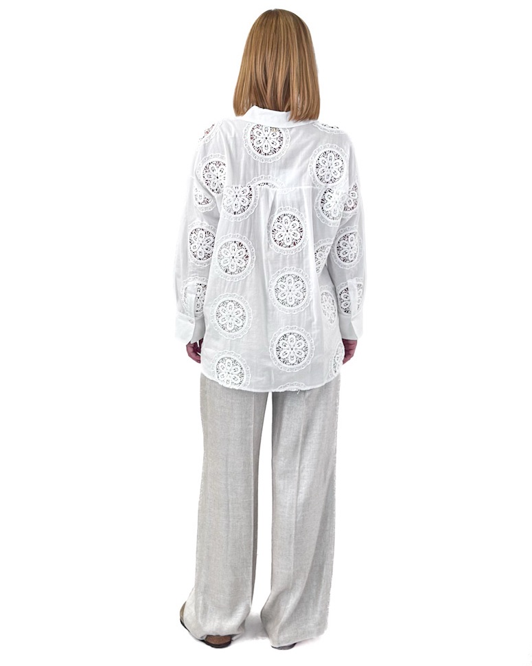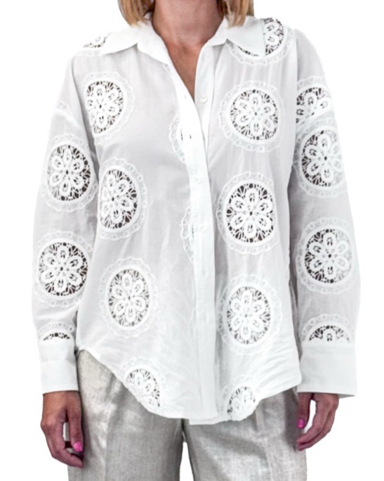 Bawełniana, kremowa, koszula z haftem z długim rękawem i guzikami, o luźnym fasonie. Stylowa, lekka i przewiewna — idealna na lato!