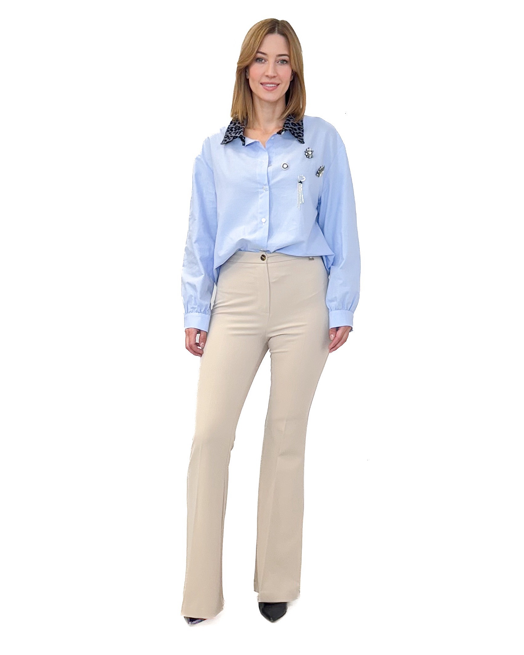 Niebieska koszula damska marki Pia B o prostym kroju z ozdobnymi broszkami i kontrastowym kołnierzykiem w zwierzęcy print.