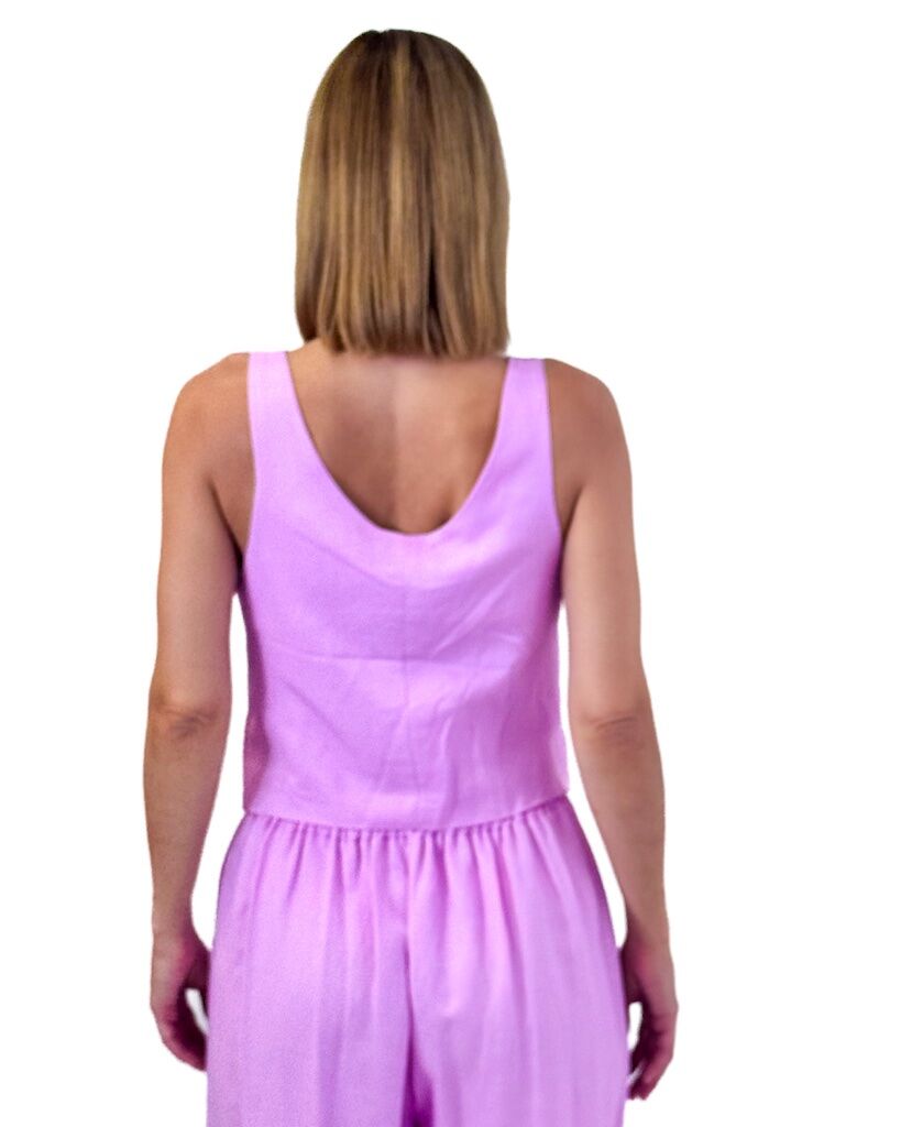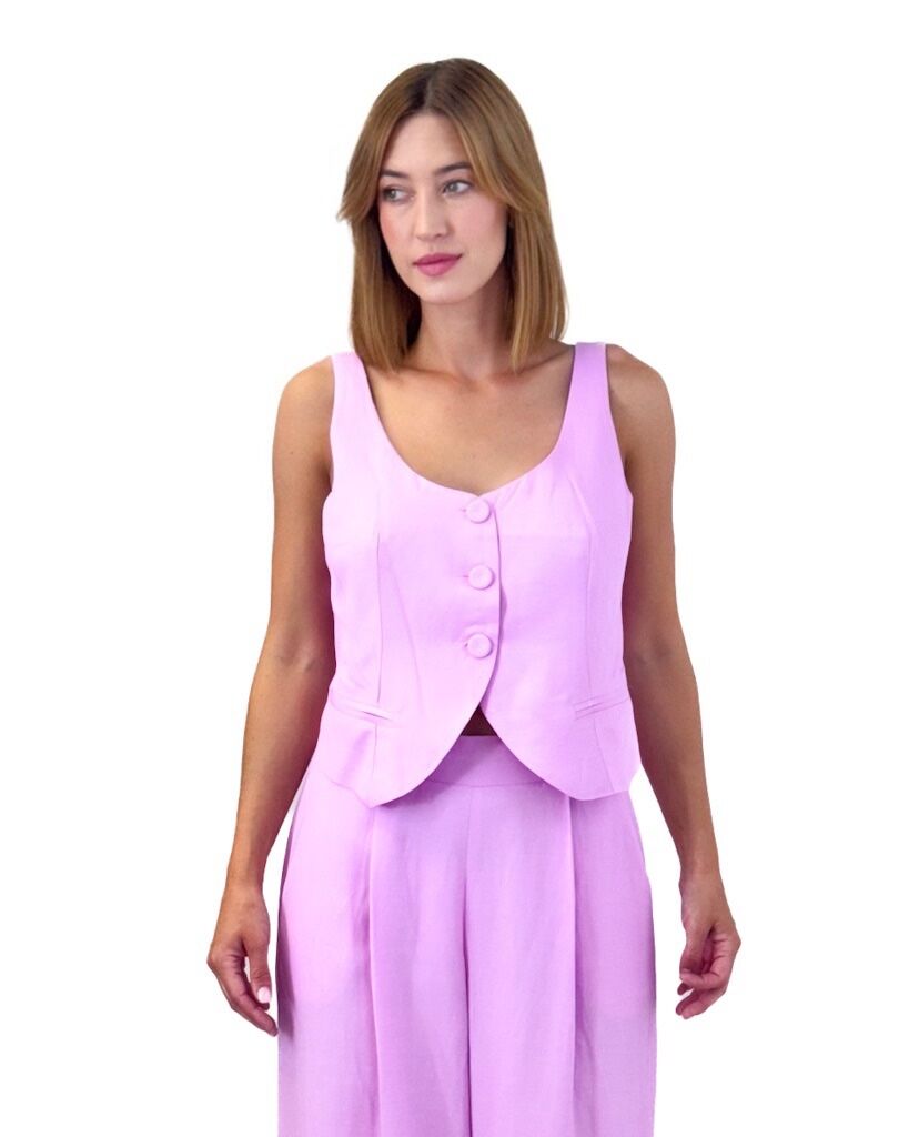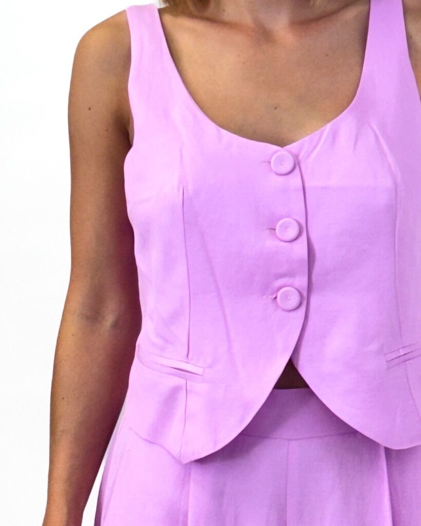 Różowa dopasowana kamizelka damska z lnu zapinana na guziki – stylowa, lekka i kobieca. Idealna na lato.