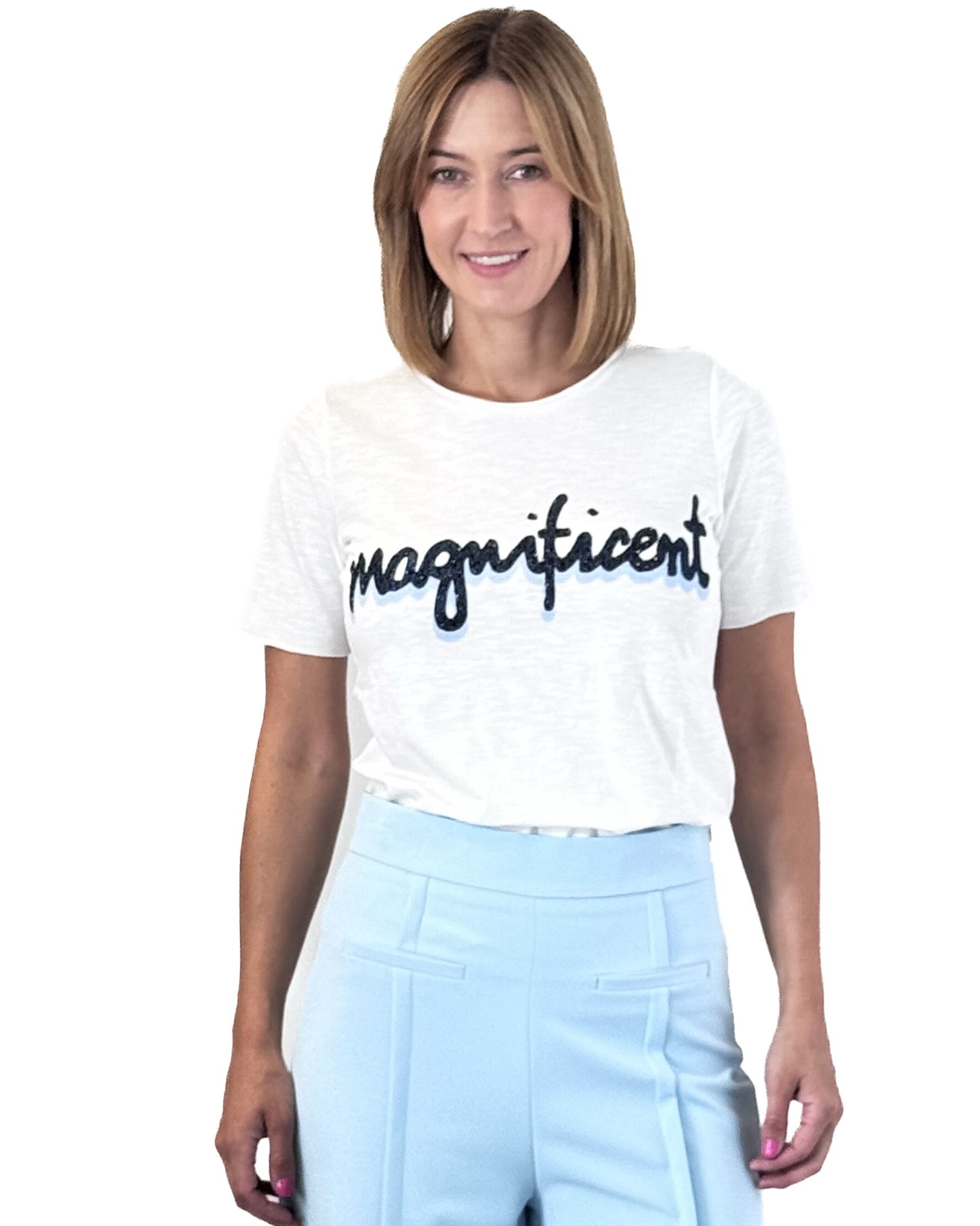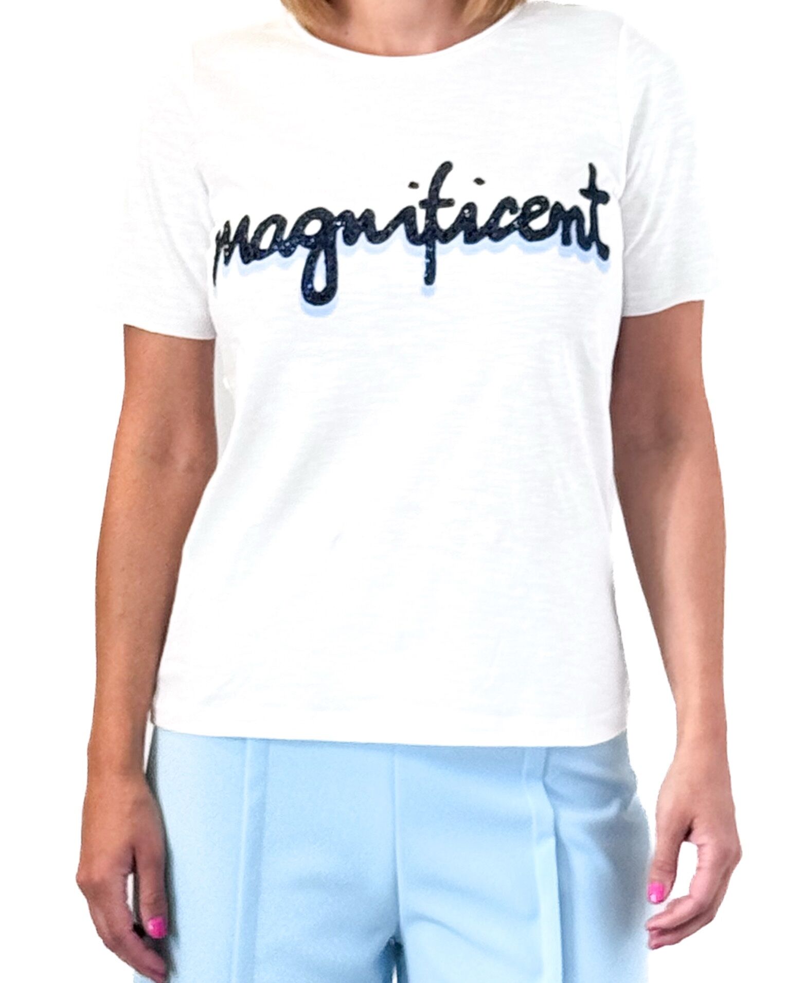 Dodaj swojej szafie klasyki z nutą nowoczesności i postaw na białą koszulkę damską z granatowym napisem i cekinami – połączenie minimalizmu i oryginalności w jednym!