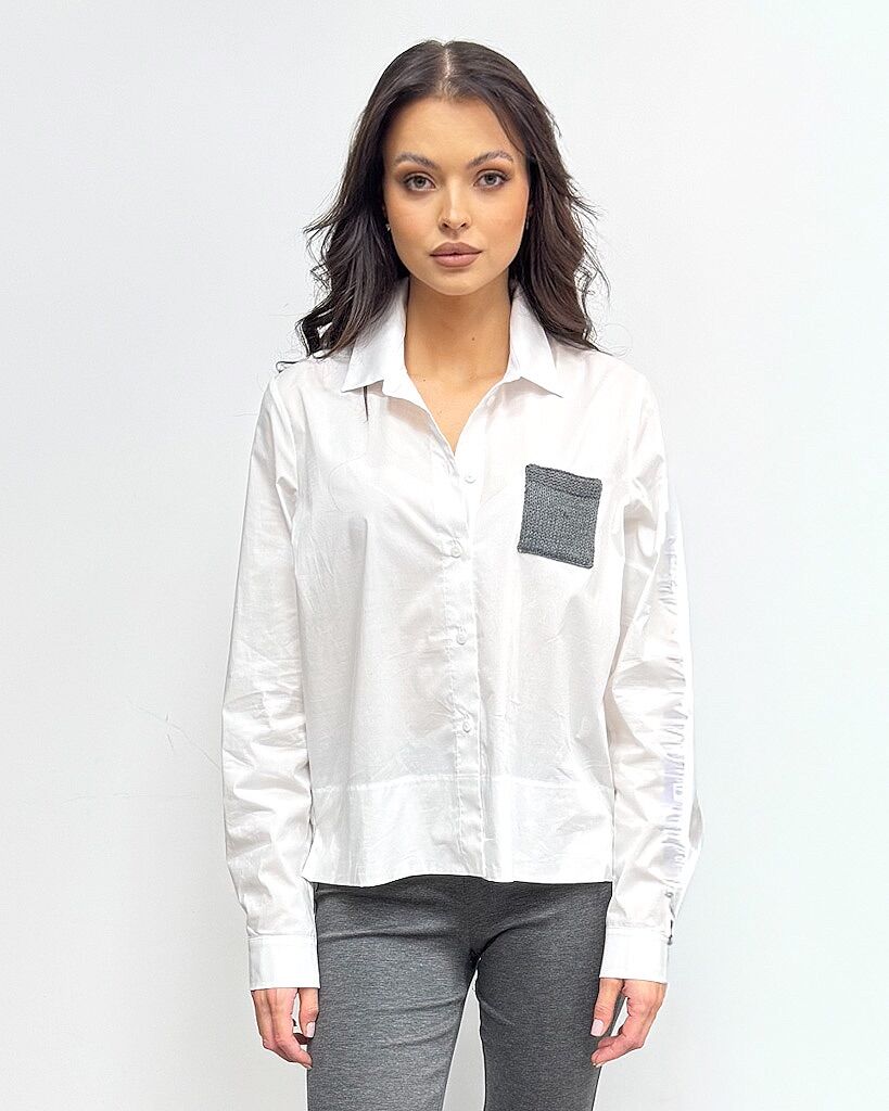 Koszula posiada klasyczny kołnierzyk oraz długi rękaw zakończony mankietem, zapinanym na guziki, co dodaje jej eleganckiego wykończenia. Model wyróżnia się subtelną asymetrią w długości oraz wyjątkową szarą, plecioną kieszonką na piersi, która pełni nie tylko funkcję praktyczną, ale przede wszystkim dekoracyjną. Ten unikalny detal nadaje koszuli charakteru i czyni ją niepowtarzalną.