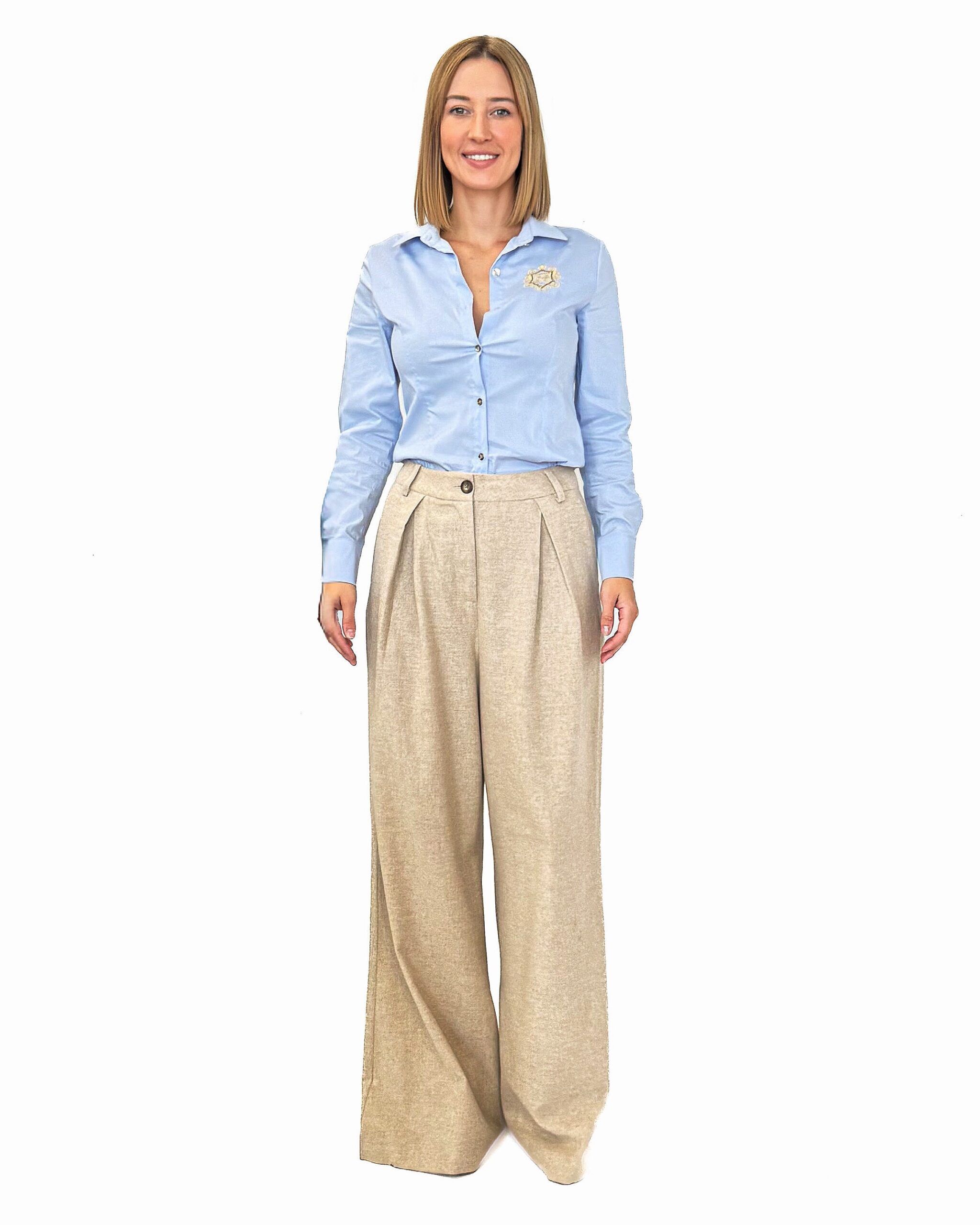 Błękitna koszula damska marki Gil Santucci z długim rękawem, zapinana na guziki. Złote wyszywane zdobienie na lewej piersi dodaje elegancji i szyku.