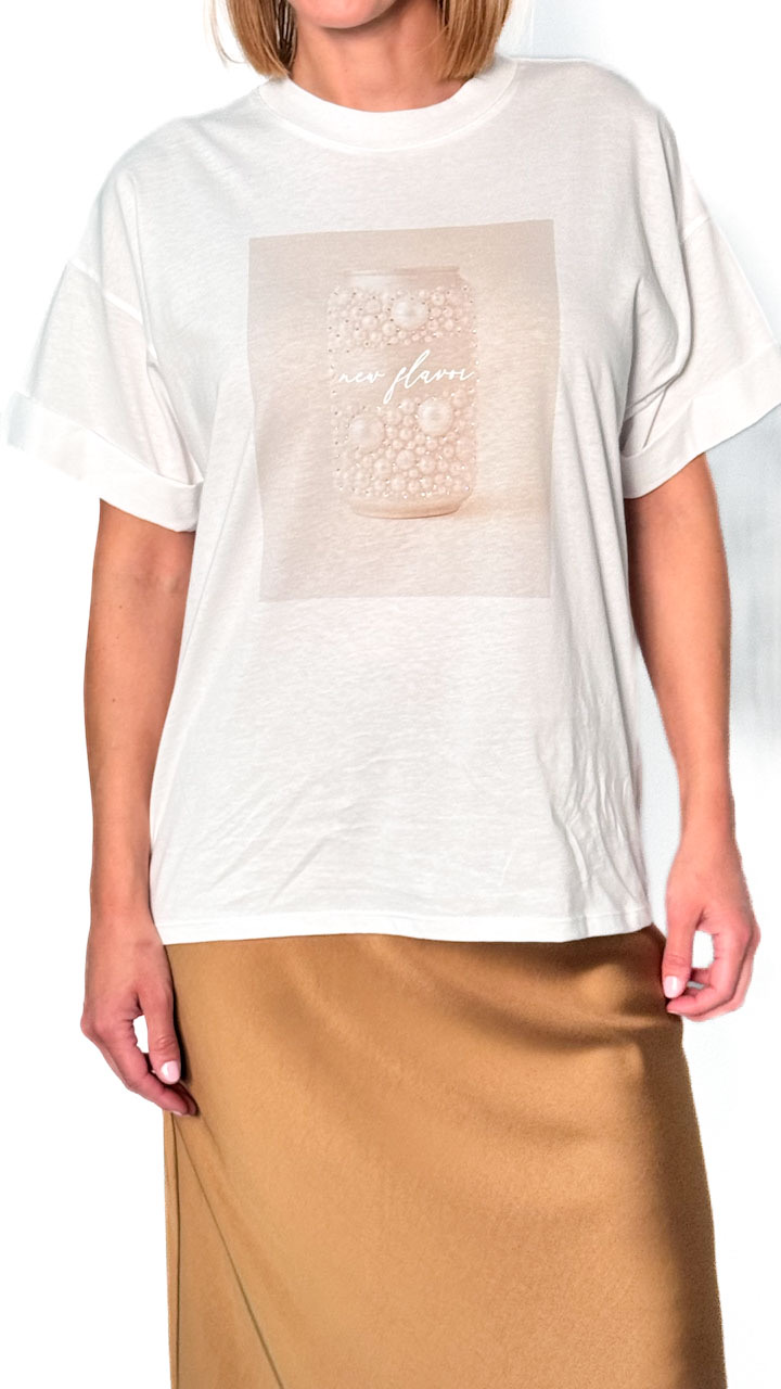 BLUZKA BIAŁA Z KRÓTKIM RĘKAWEM, BEŻOWY NADRUK I CEKINY IMPERIAL TW99JGT