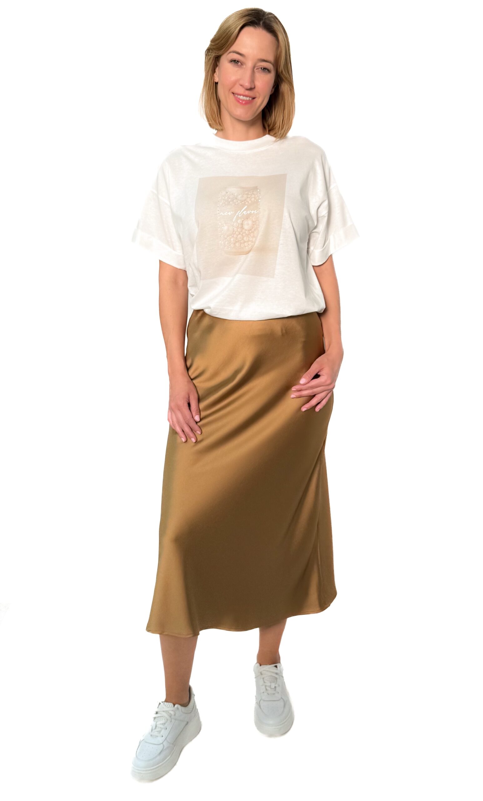 Opis: Luźny krój, rękaw krótki zakończony mankietem, dekolt okrągły, nadruk w beżowym kolorze ozdobiony drobnymi cekinami