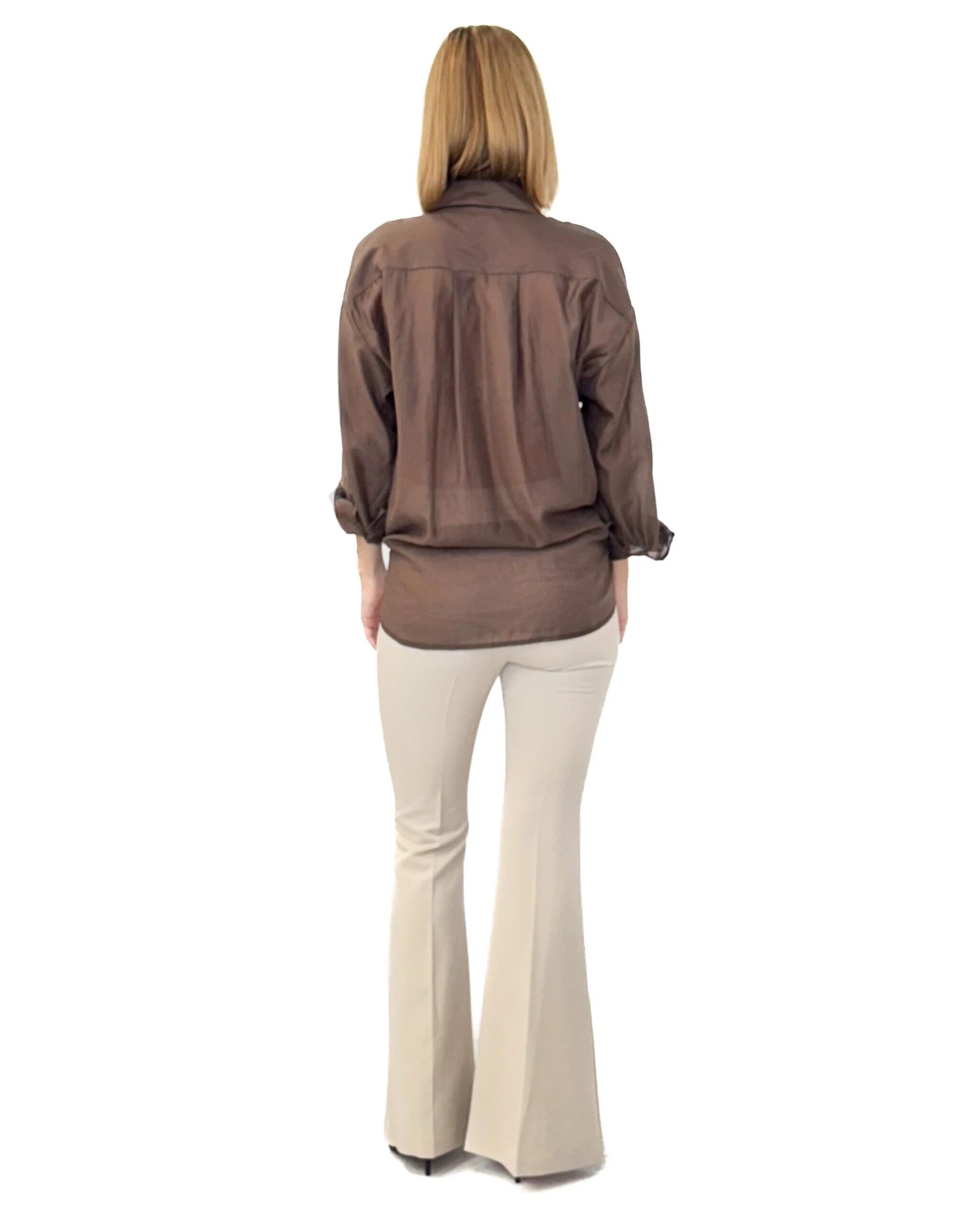 Damska, czekoladowa koszula z lyocellu o klasycznym fasonie zapinana na guziki. Stylowa i modna – idealna na każdą porę roku!