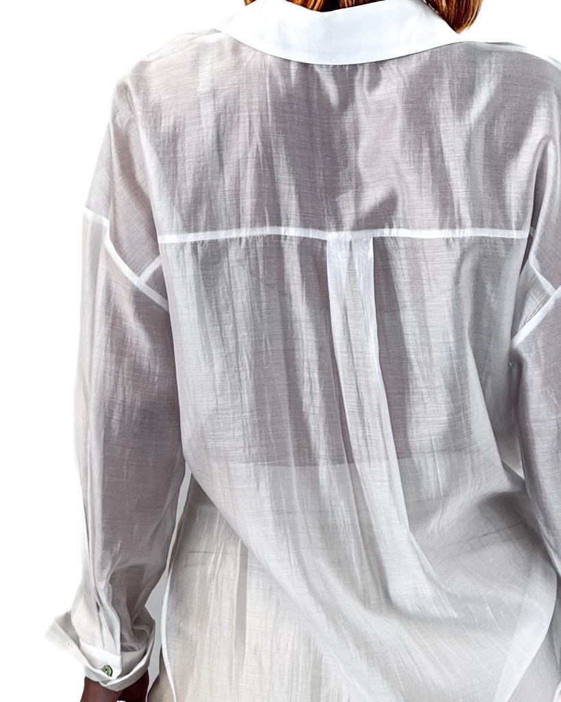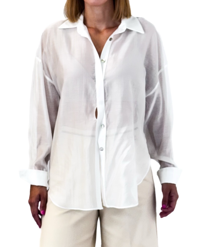 Przewiewna biała koszula damska z lekkiego materiału. Klasyczny krój, idealna na ciepłe dni, do pracy lub na wakacje.
