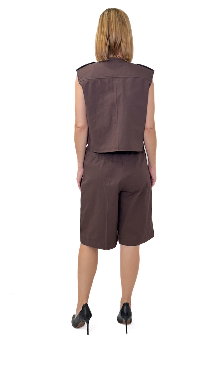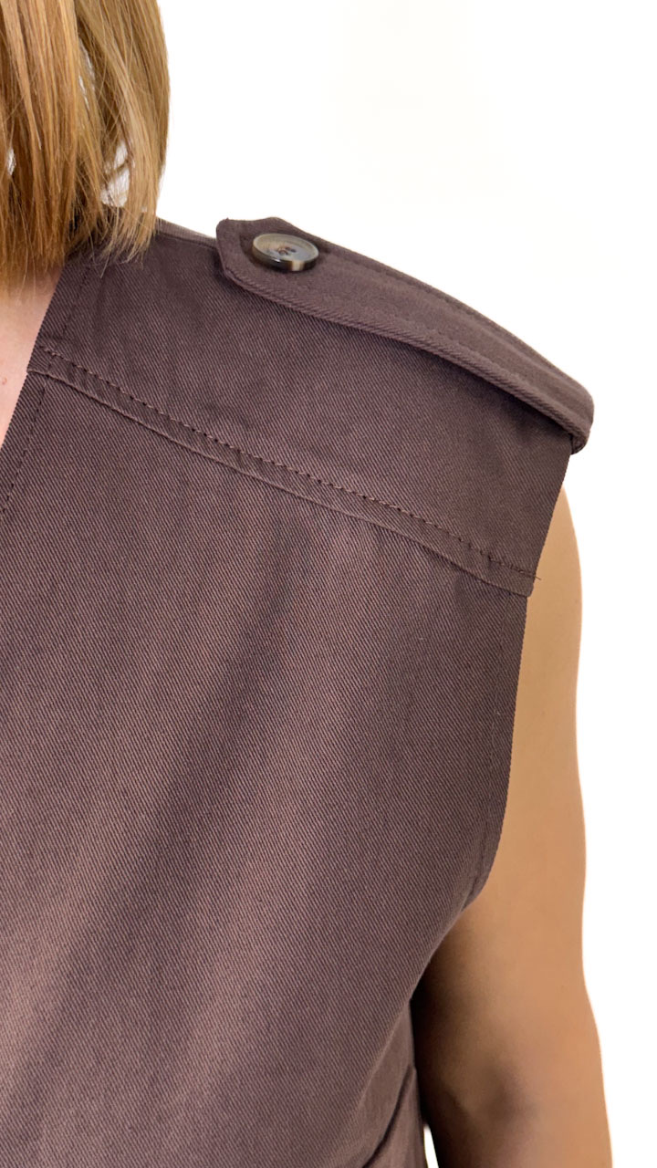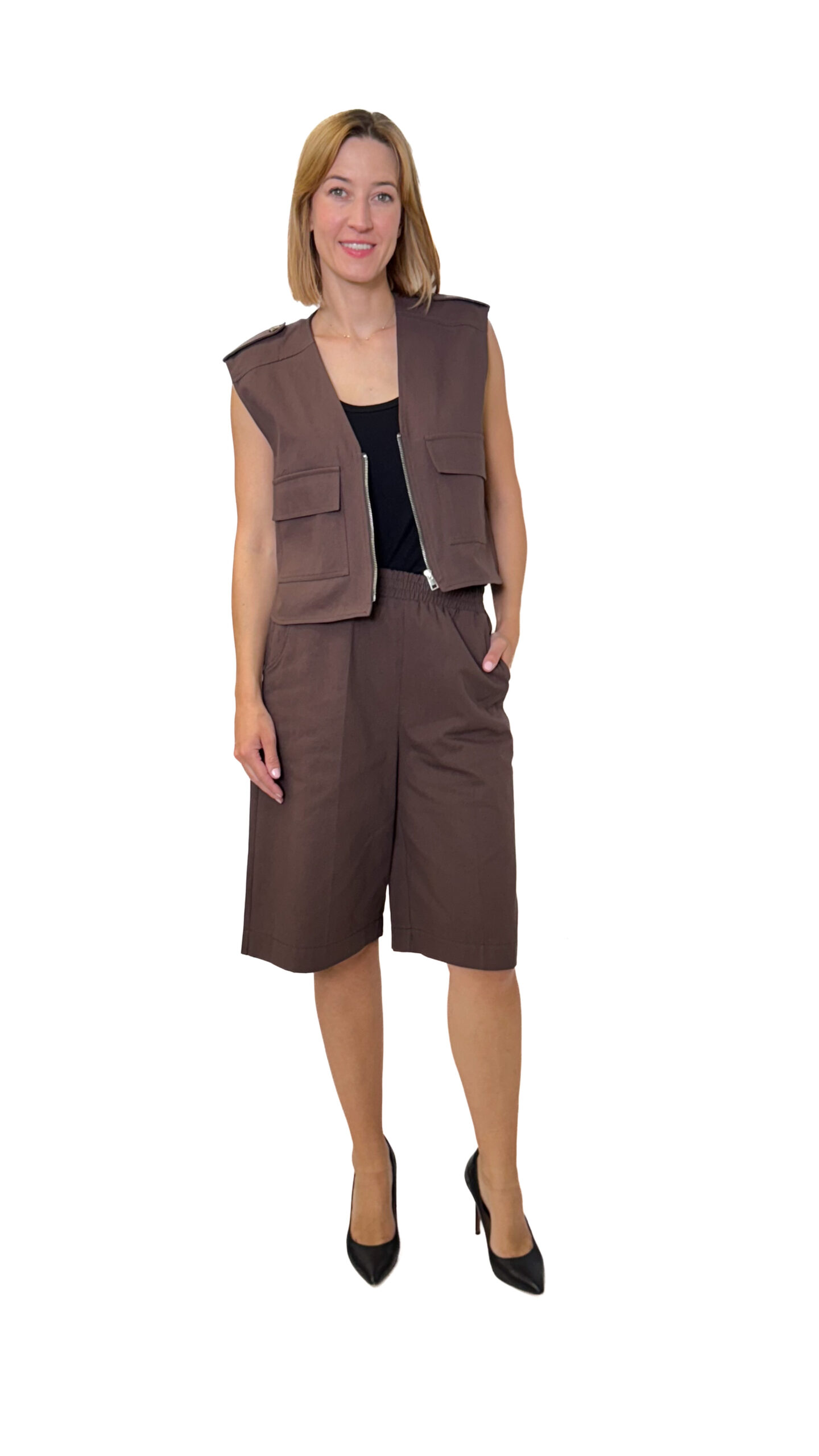 Damska kamizelka o luźnym fasonie w kolorze brązowym zapinana na suwak. Swobodny krój zapewnia komfort noszenia i pasuje do różnych typów sylwetki. Można ją nosić na bluzkę, koszulę czy cienki sweter – sprawdzi się przez cały rok.