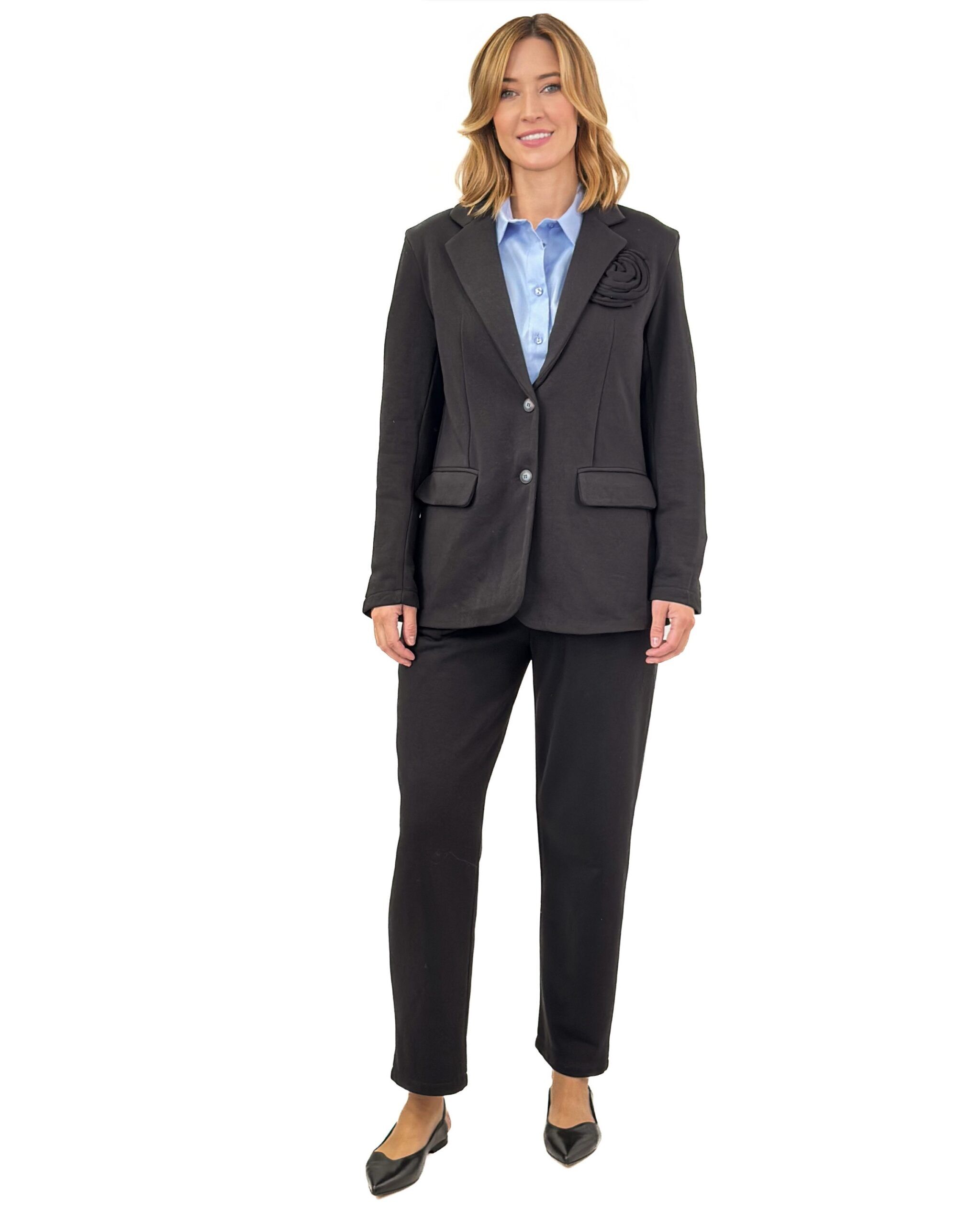 Czarna dresowa marynarka damska o luźnym fasonie to połączenie komfortu i nowoczesnego stylu. Wykonana z miękkiego, przyjemnego materiału, idealna na co dzień i casualowe wyjścia. Marynarka wyróżnia się oryginalną, ozdobną aplikacją na piersi oraz kontrastową niebieską podszewką, które dodają jej charakteru i unikalnego designu. Zapinana na dwa guziki, z praktycznymi kieszeniami z przodu, sprawdzi się jako modny dodatek do wielu stylizacji — zarówno z jeansami, jak i bardziej eleganckimi spodniami czy spódnicą. Luźny krój zapewnia swobodę ruchów i wygodę noszenia przez cały dzień.