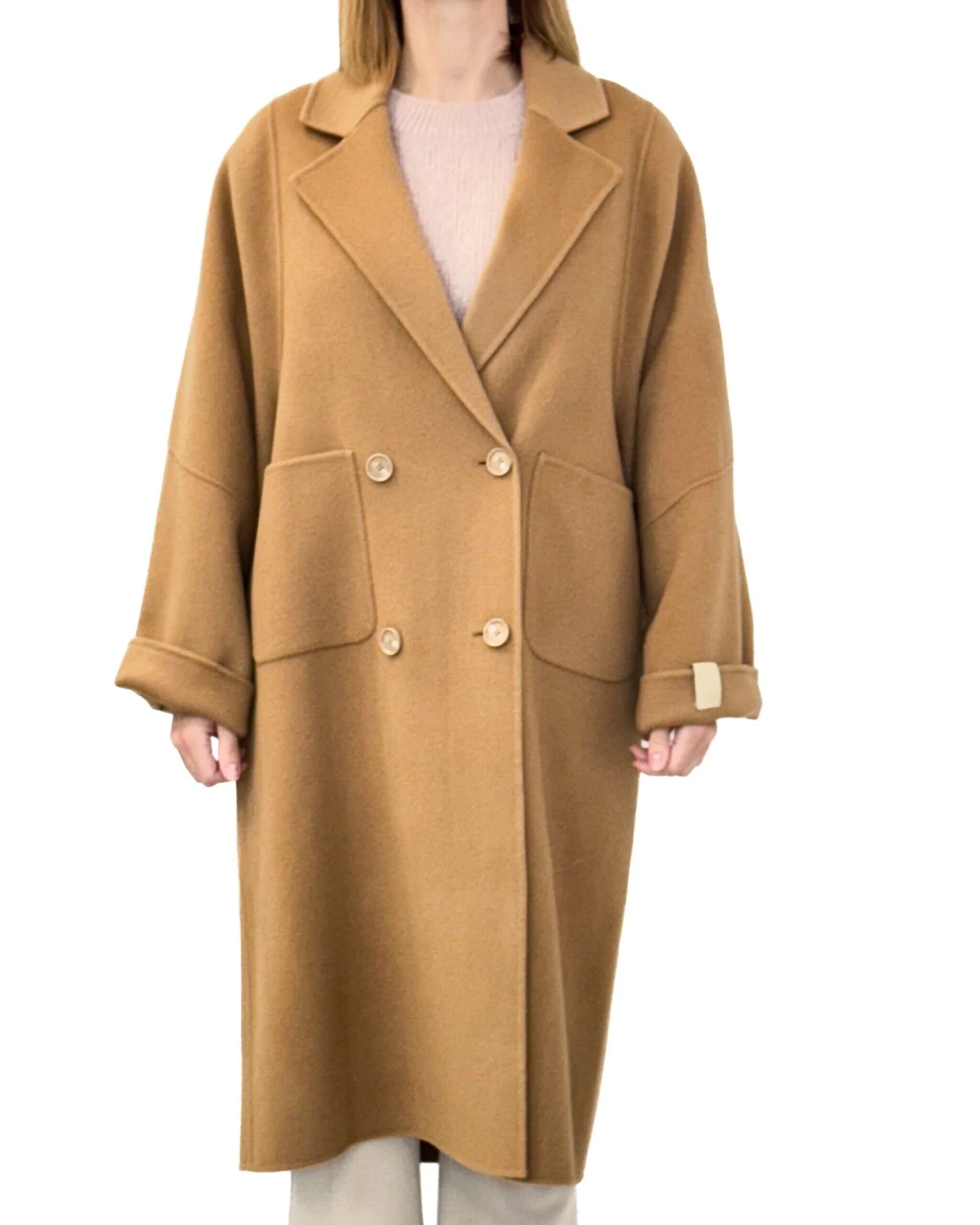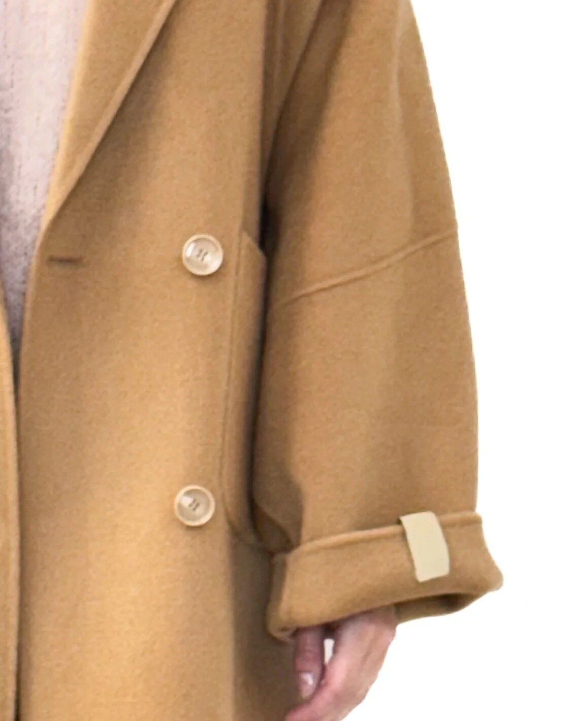 Camelowy wełniany płaszcz damski zapinany na guziki, długość do kolan z kieszeniami i naszywką. Stylowy, ciepły i uniwersalny na każdą okazję!