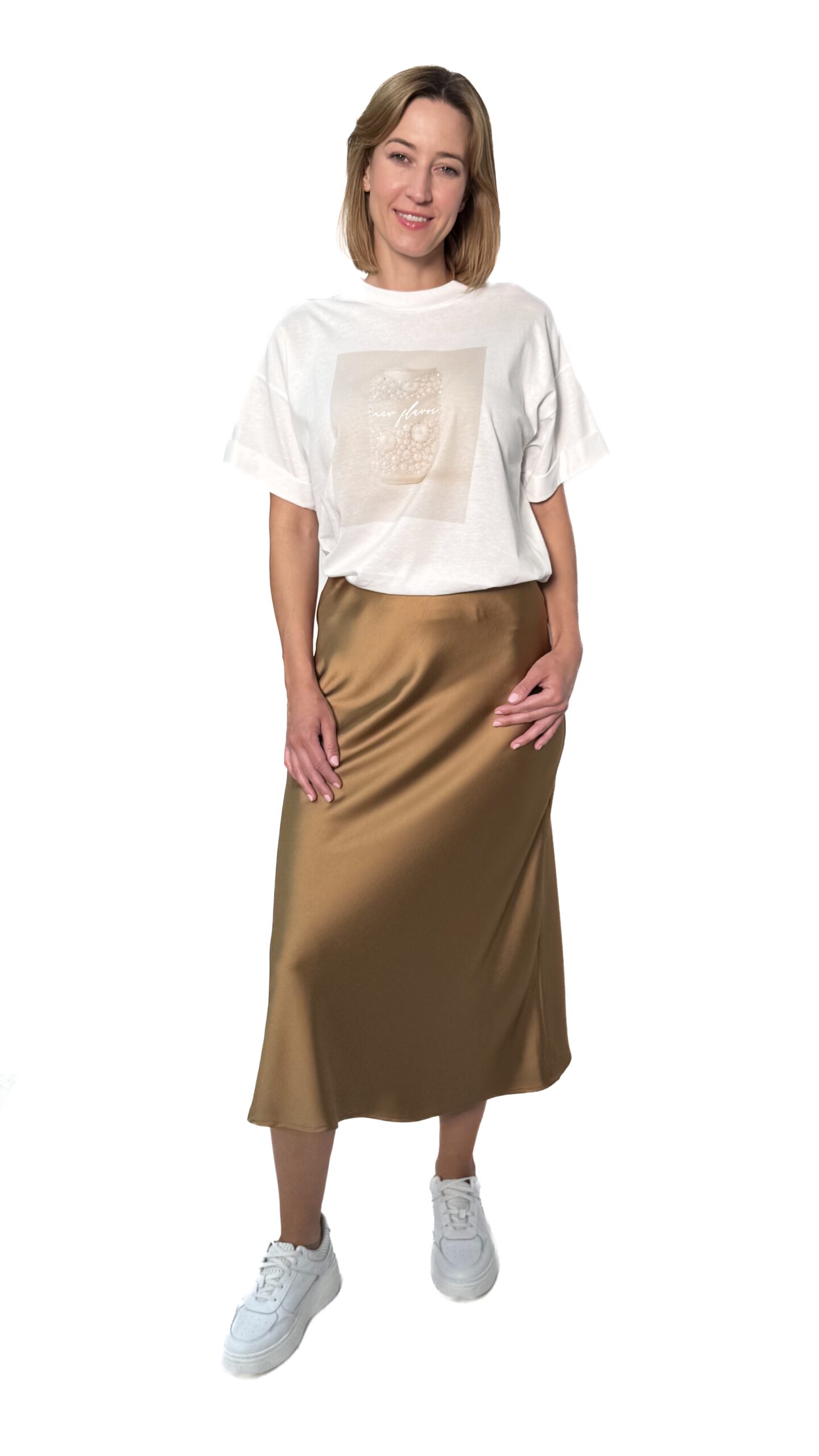 Długa spódnica z delikatnej, połyskującej satyny w odcieniu głębokiego brązu to must-have w każdej kobiecej garderobie. Zwiewny krój pięknie układa się podczas ruchu, dodając sylwetce lekkości i szyku. Satynowy materiał subtelnie odbija światło, nadając stylizacji eleganckiego charakteru – idealna zarówno na specjalne okazje, jak i codzienne wyjścia. Brązowy kolor doskonale komponuje się z neutralnymi i złotymi dodatkami.