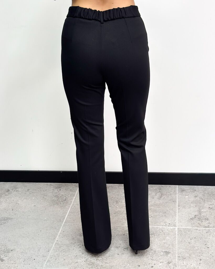 Stylowe czarne, eleganckie spodnie z materiału z ozdobnym paskiem. Elegancja, wygoda i perfekcyjne dopasowanie – idealne do pracy i na wieczór.