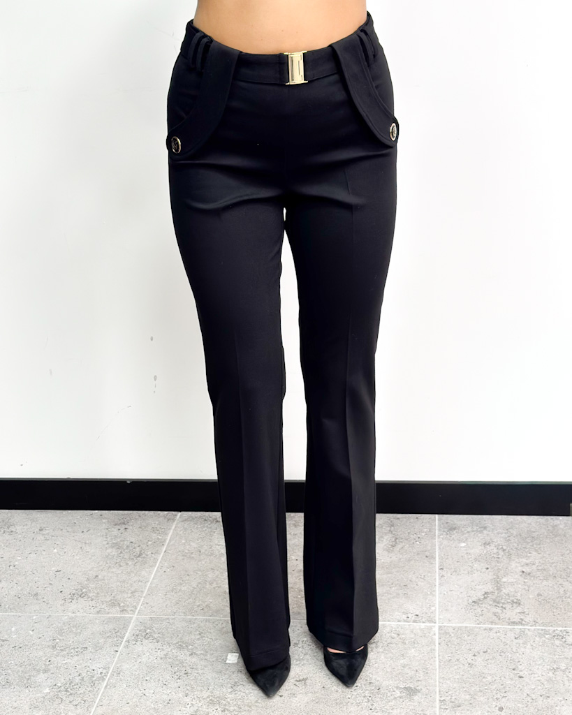 Damskie czarne eleganckie spodnie z ozdobnym paskiem to klasyka w nowoczesnym wydaniu. Model o lekko rozszerzanej nogawce pięknie wysmukla sylwetkę, a wysoki stan podkreśla talię i zapewnia idealne dopasowanie. Stylowe guziki oraz metalowa klamra dodają im wyjątkowego charakteru i subtelnej elegancji.