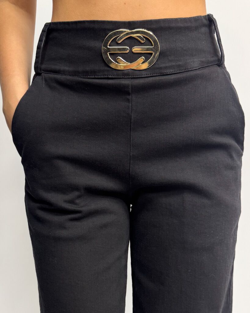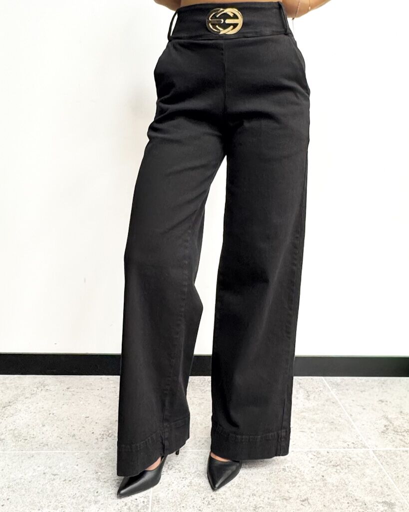 Czarne jeansy z szeroką nogawką i wysokim stanem włoskiej marki Babylon. Miękki materiał, złota ozdobna blaszka – styl i wygoda w jednym.