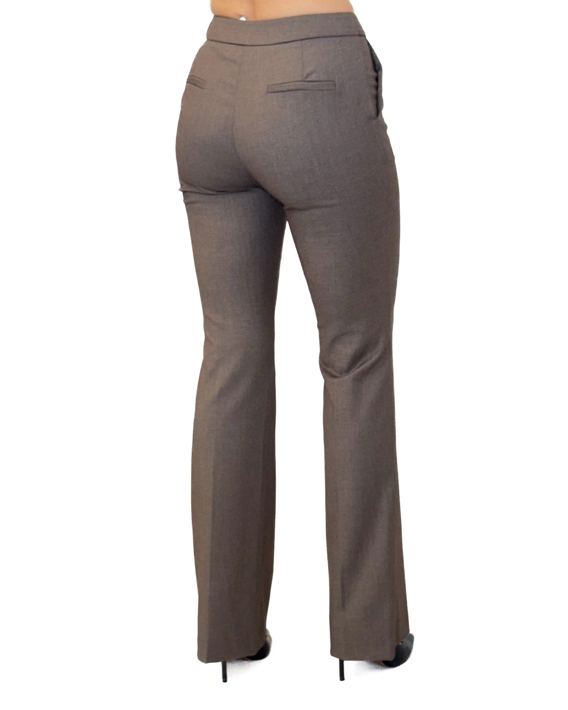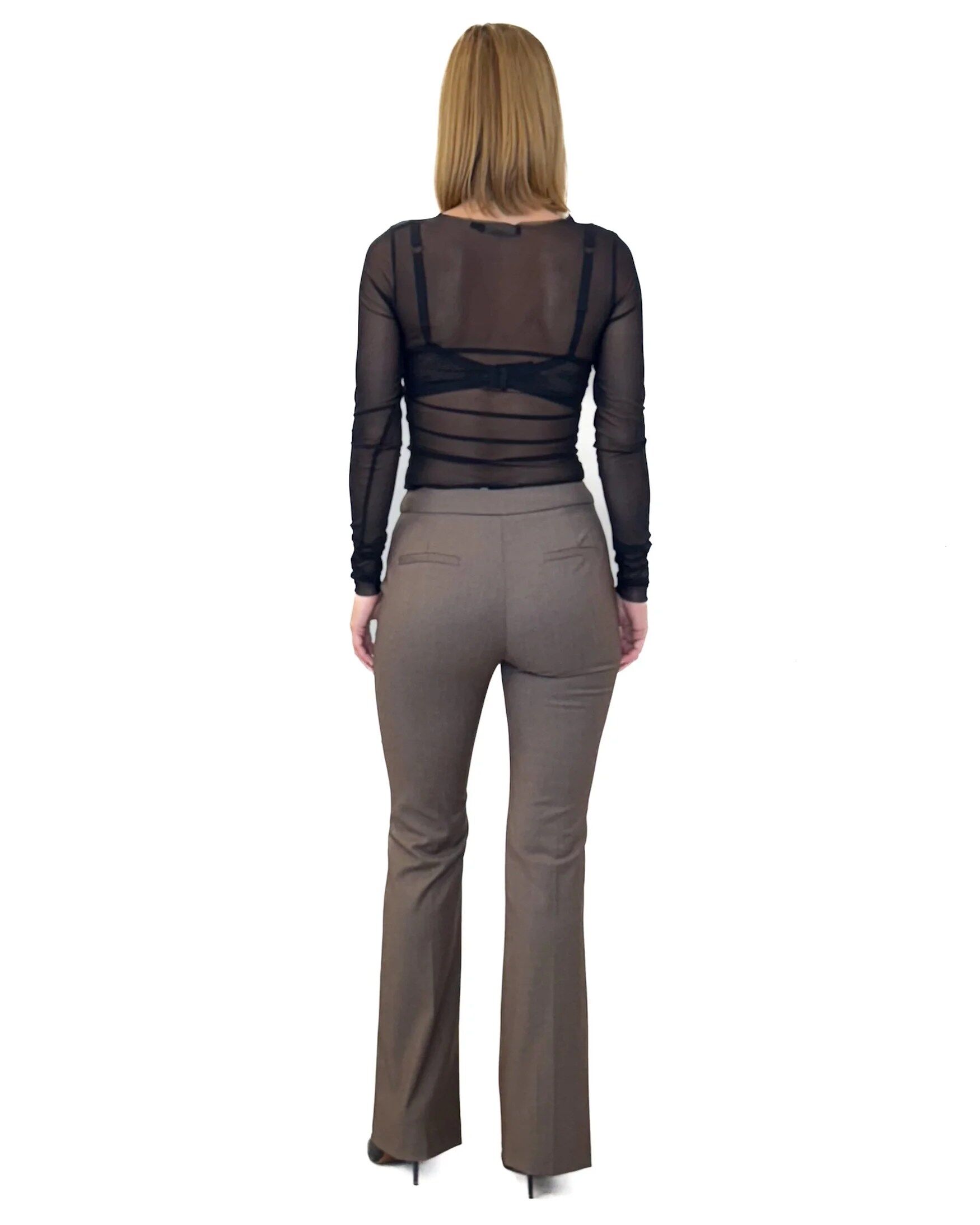 Czekoladowe spodnie materiałowe z rozszerzaną nogawką typu dzwony. Wygodne, stylowe i zapinane na złoty logowany guzik. Idealne do jesiennych stylizacji.