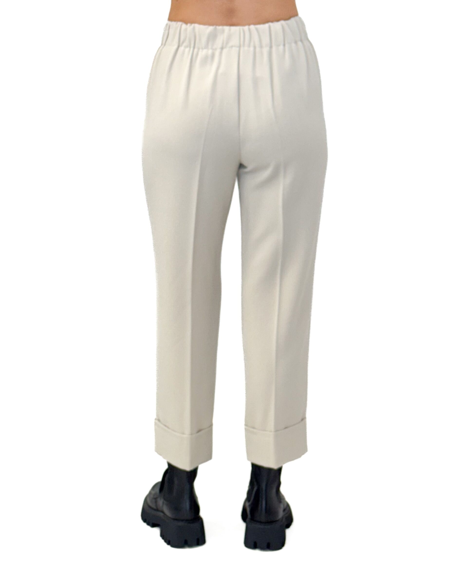 Kremowe spodnie z gumką w pasie, prostą nogawką i mankietami to uniwersalny element garderoby, który łatwo dopasować do różnych stylizacji.