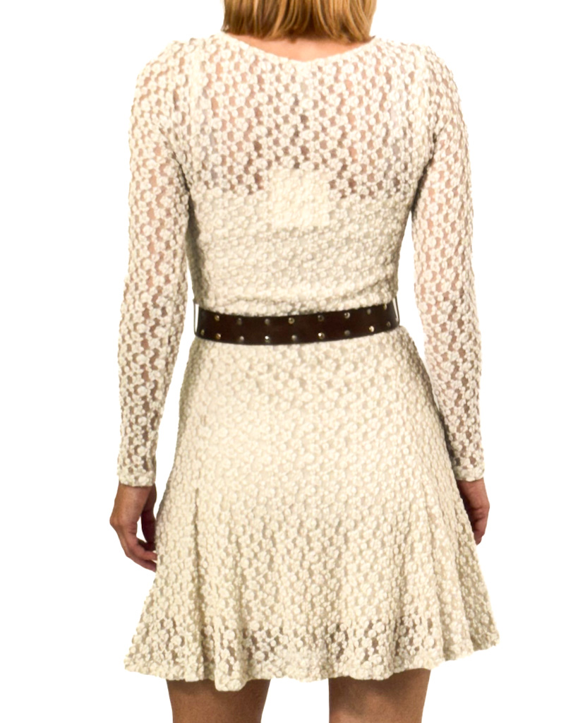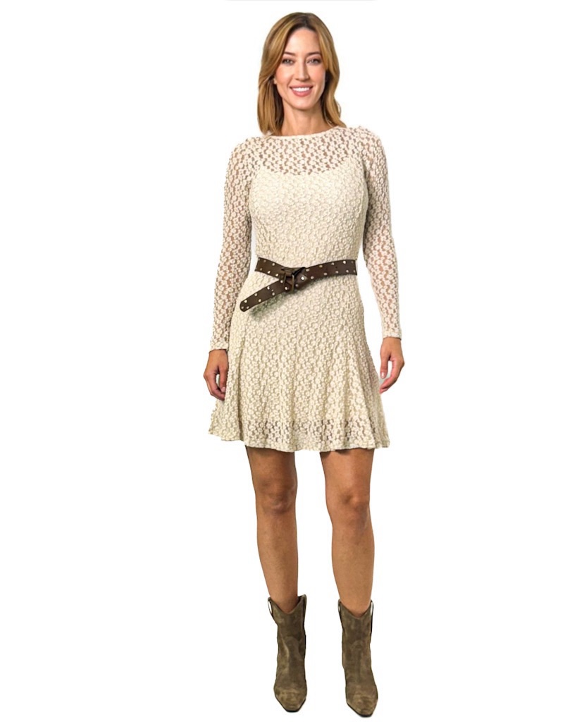 Wybierz tę kremową koronkową sukienkę z długim rękawem, rozkloszowanym dołem, halką i paskiem, aby podkreślić swoją stylizację na każdą ważną okazję. To idealna propozycja dla kobiet ceniących sobie elegancję, komfort oraz ponadczasowy design.