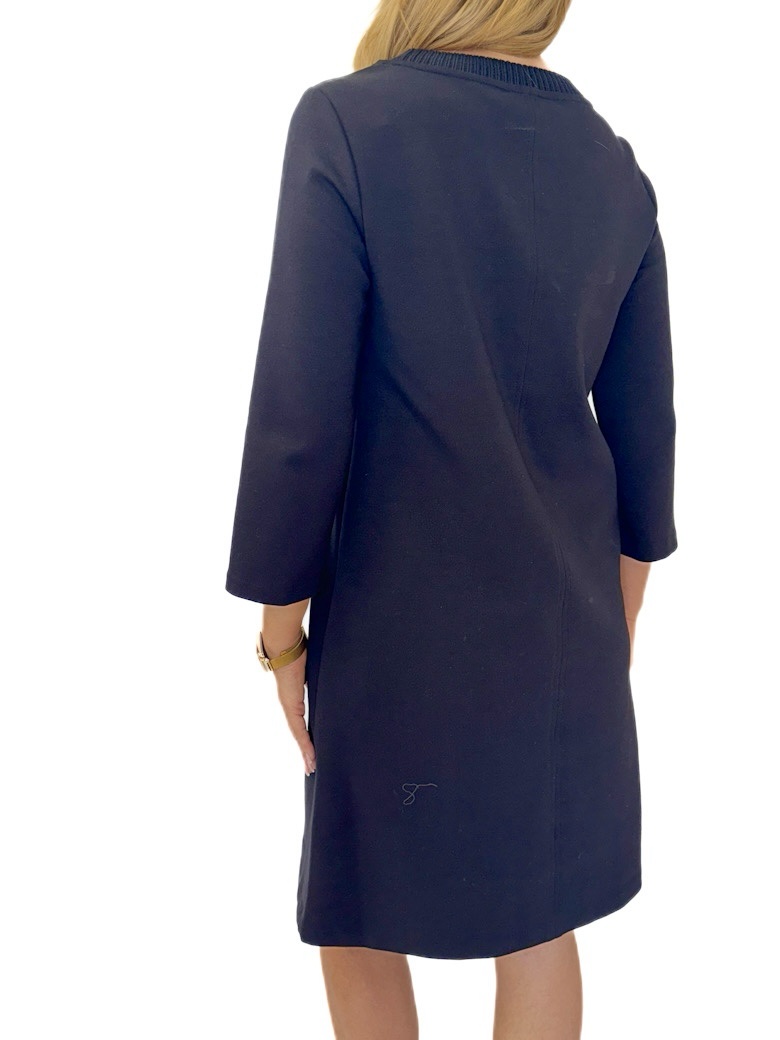 Opis: Rękaw za łokieć, długość do kolan, dekolt okrągły obszyty ściągaczem , ozdobna pleciona kieszonka oraz złoty guzik, materiał gładki, fason luźny