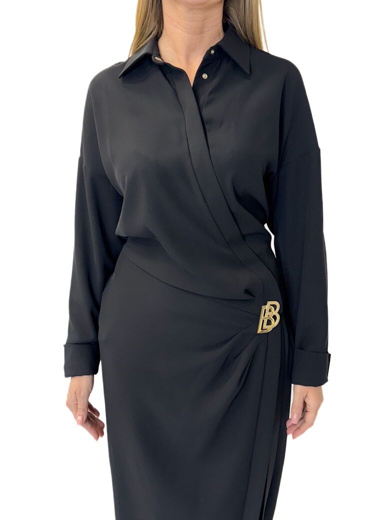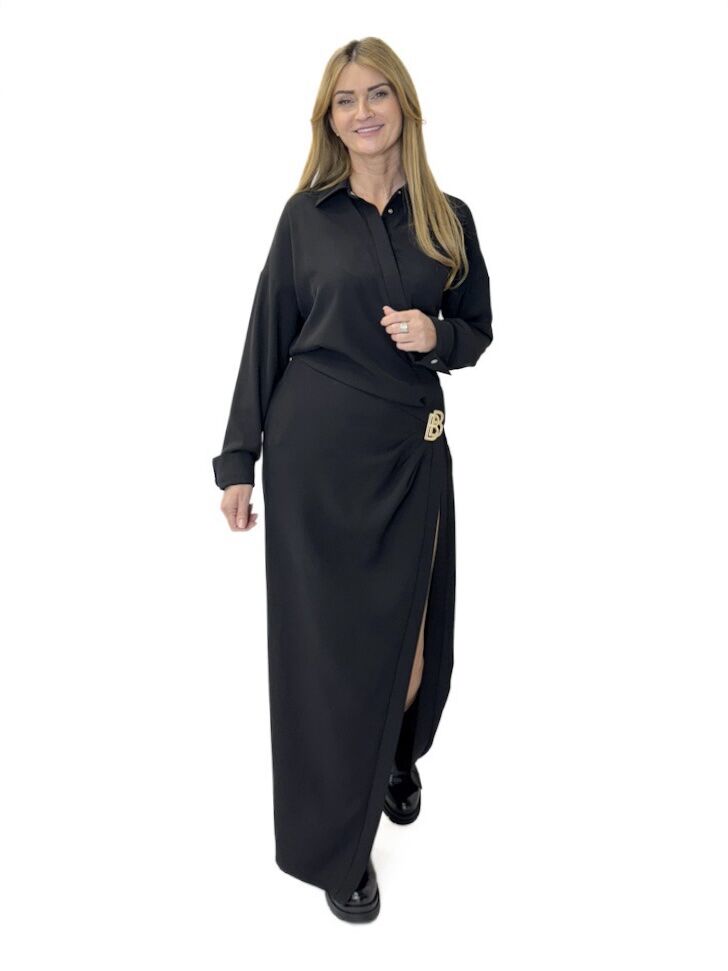 Długa, czarna, elegancka sukienka z długim rękawem i kołnierzykiem to połączenie elegancji, klasyki i nowoczesnego designu. Wykonana z wysokiej jakości materiału, zapewnia komfort noszenia i perfekcyjne dopasowanie do sylwetki. Stylowe rozcięcie na jedną nogę nadaje sukience lekkości i subtelnej zmysłowości, jednocześnie podkreślając nogi.Dodatkowym elementem wyróżniającym jest złota blaszka z logo marki umieszczona w pasie, która nadaje całości luksusowego charakteru i dodaje elegancji każdej stylizacji.