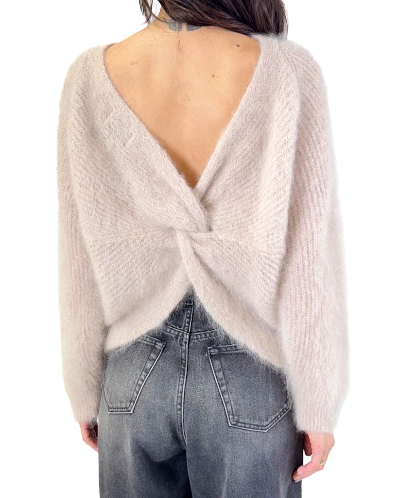 Miękki, moherowy beżowy sweter damski o luźnym fasonie i długich rękawach. Tylny dekolt V z ozdobnym skręconym splotem — elegancja i komfort w jednym.