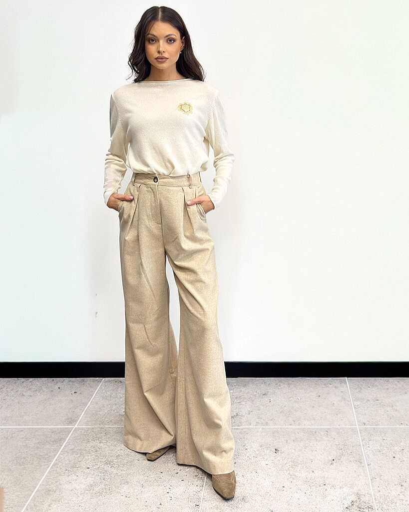Śmietankowy sweter damski z wełną i kaszmirem od marki Gil Santucci. Minimalistyczny fason, długi rękaw, złote logo marki. Elegancja i komfort w jednym.