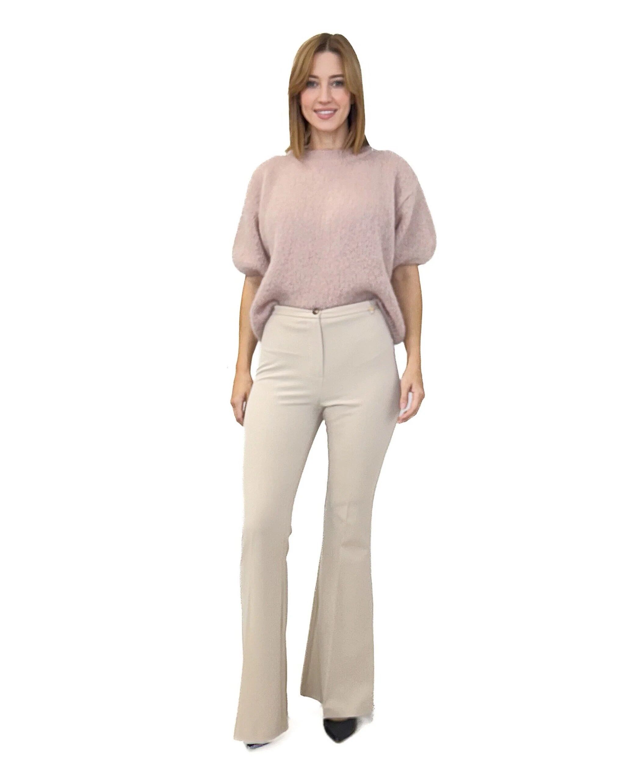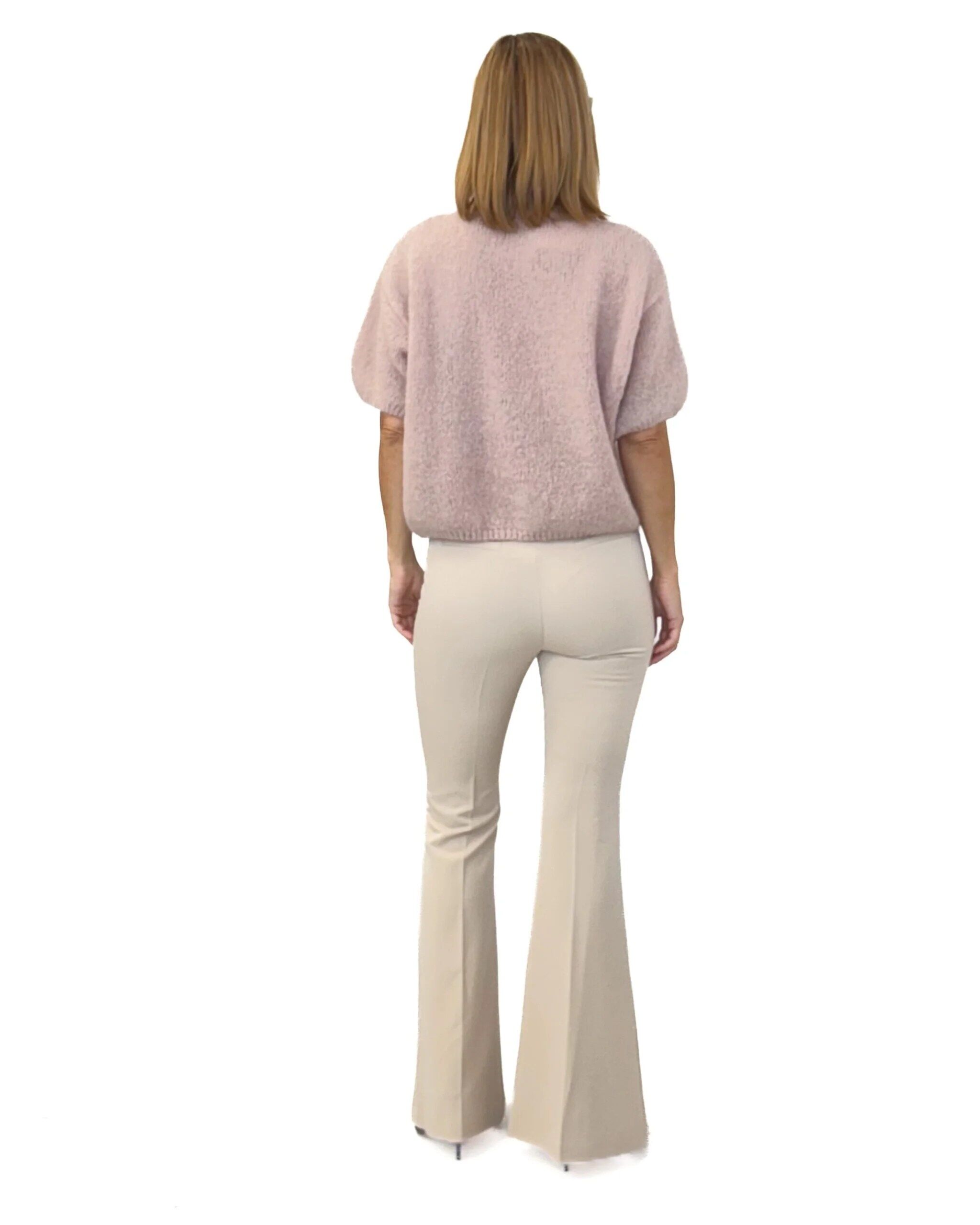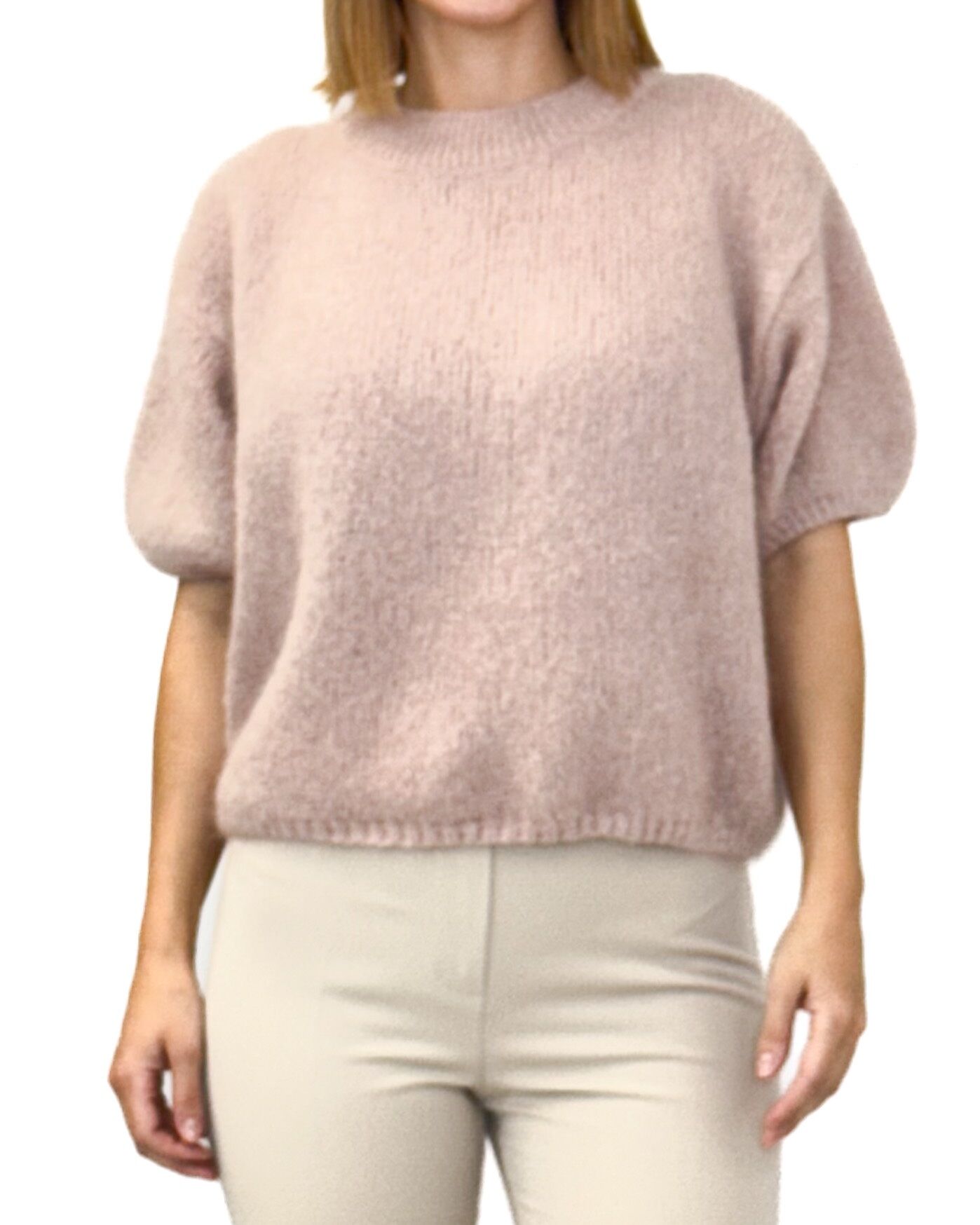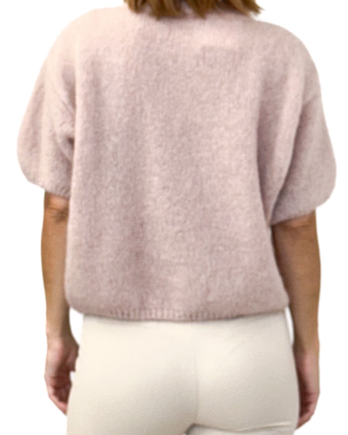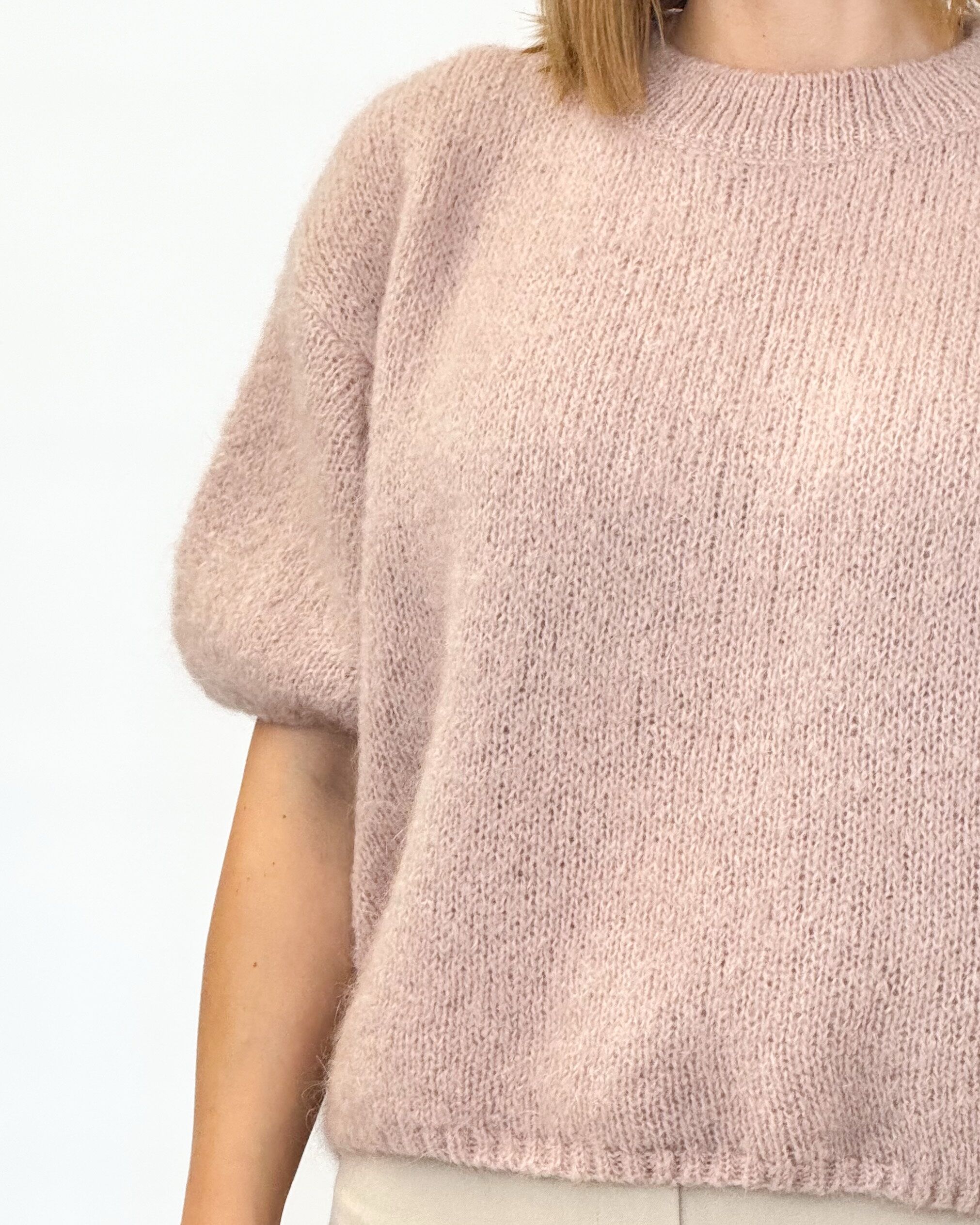 Sweter z krótkim rękawem w kolorze pudrowego różu, wykonany z mieszanki moheru i wełny. Luźny fason, okrągły dekolt – idealne połączenie elegancji i wygody.